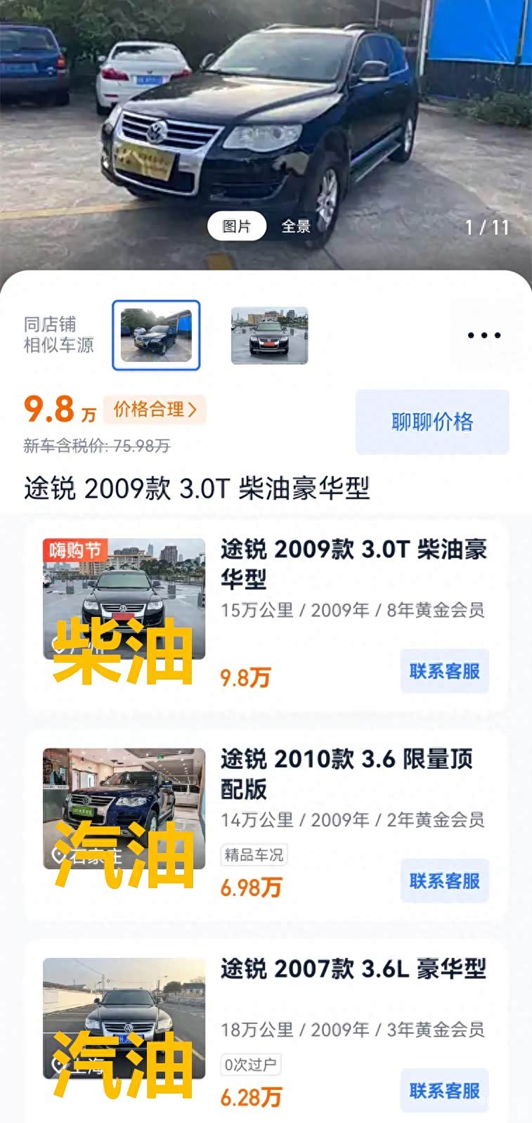 简单聊一下柴油版的大众途锐吧,这款车其实在二手市场上是相当抢手的,车源可以说是一辆难求,就算你能找到车源,那基本也都是超级大破烂车况了,破烂车况不说,它的二手车价格还不便宜,可以说柴油版大众途锐在整个大众品牌系,都属于一款相当保值的车,像这款09年的,当年新车售价75万左右,现在15年过去了,二手车依旧能卖个10万左右,甚至更高。而汽油版的同年途锐基本就在5万左右...