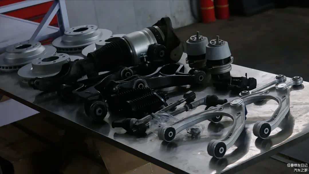 底盘方面的配件也一起订来了,因为拆了元宝梁,可以同时施工,也比较方便。底盘就是更换掉前后摆臂、球头、拉杆、还有机脚、防倾杆胶套,更新一套刹车盘皮,原厂避震是车主自带的,据说是做过维修,咱们帮装配即可。