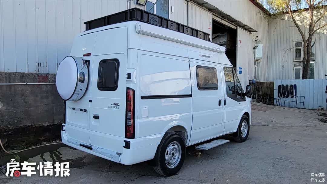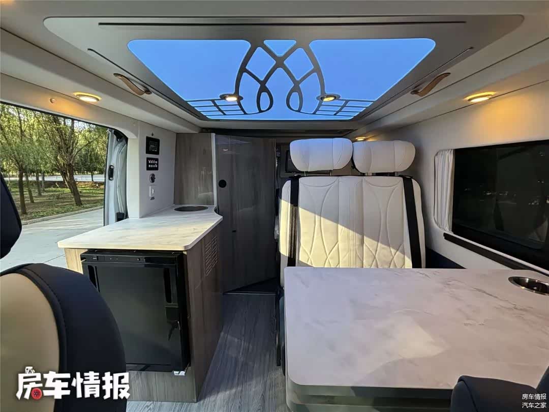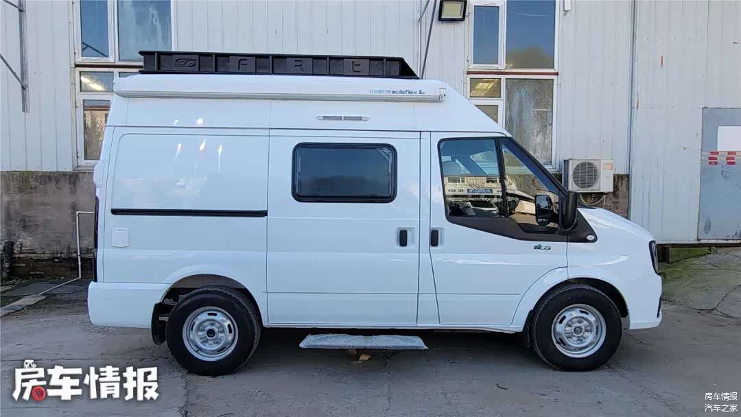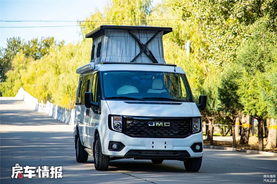 这宽车采用短轴中顶底盘打造,车长仅为5140毫米,宽度为2005毫米,车高为2575毫米,为了让车内获得更高空间,车顶部黑色部分为升高部分,并不是行李架。
