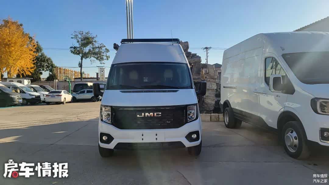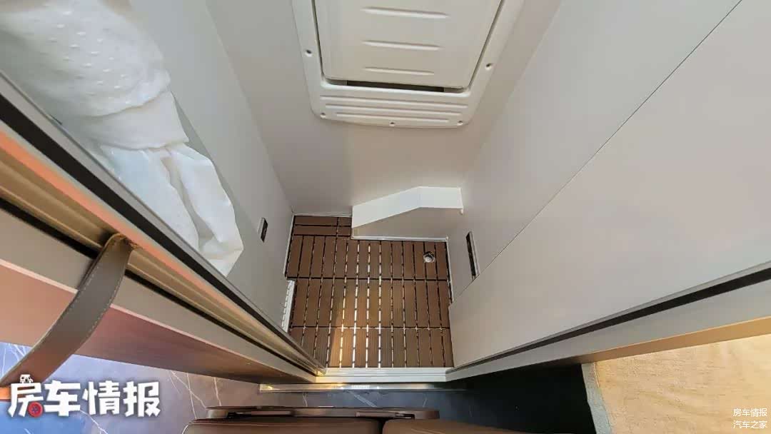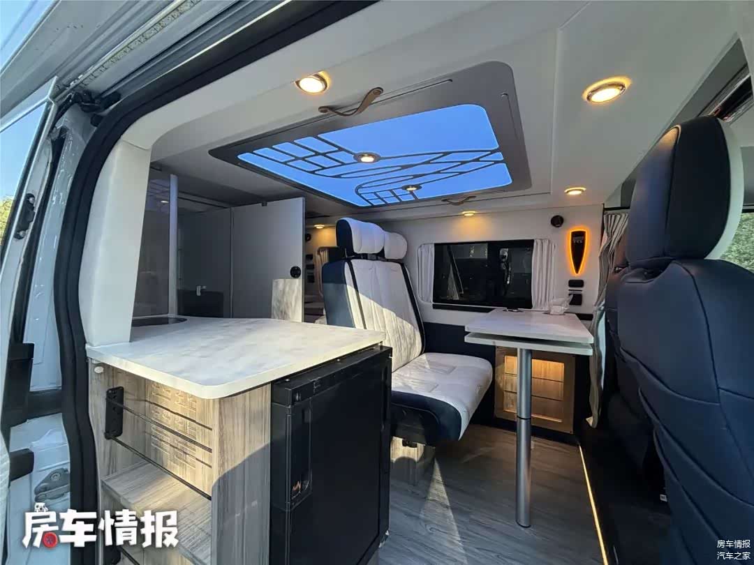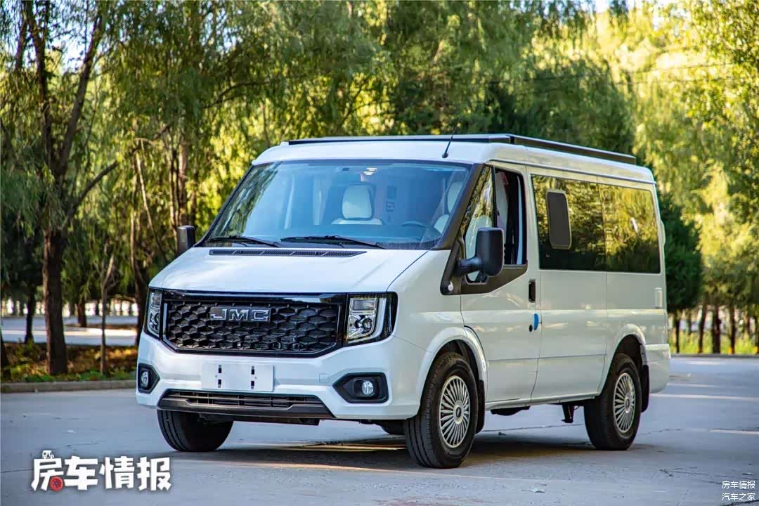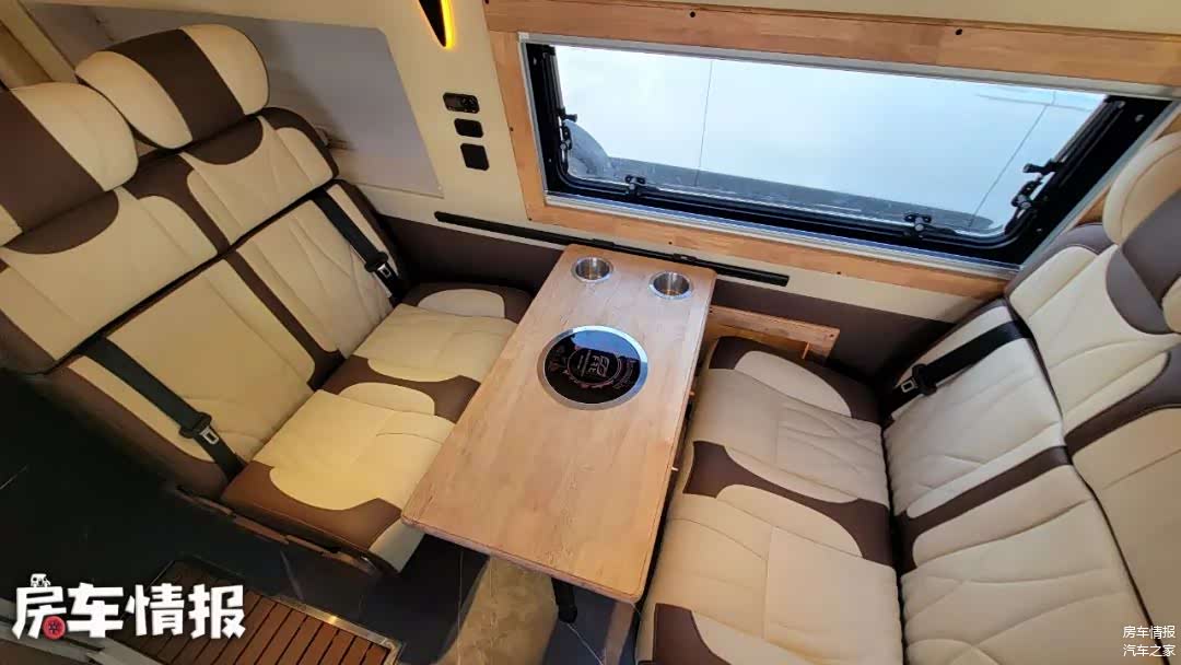 这宽车采用短轴中顶底盘打造,车长仅为5140毫米,宽度为2005毫米,车高为2575毫米,为了让车内获得更高空间,车顶部黑色部分为升高部分,并不是行李架。