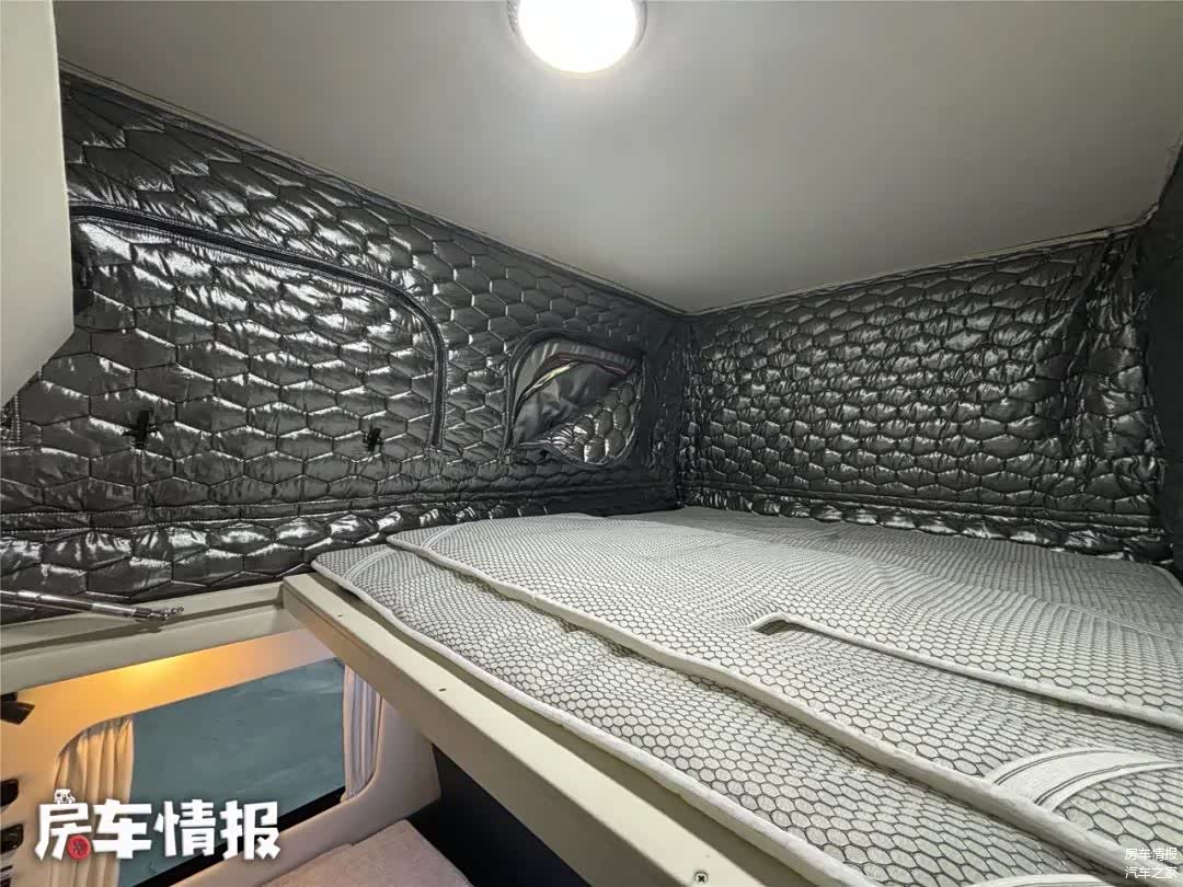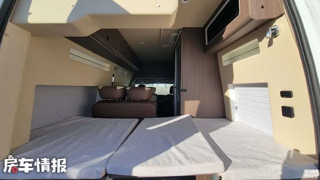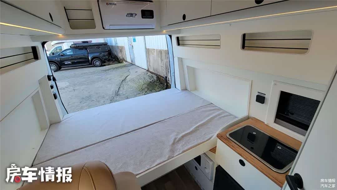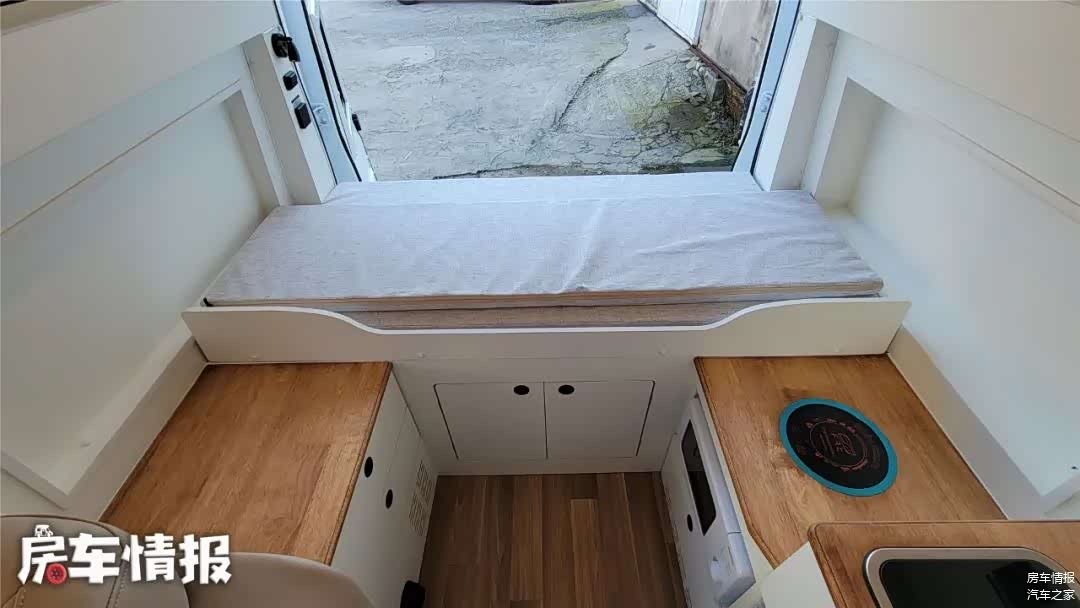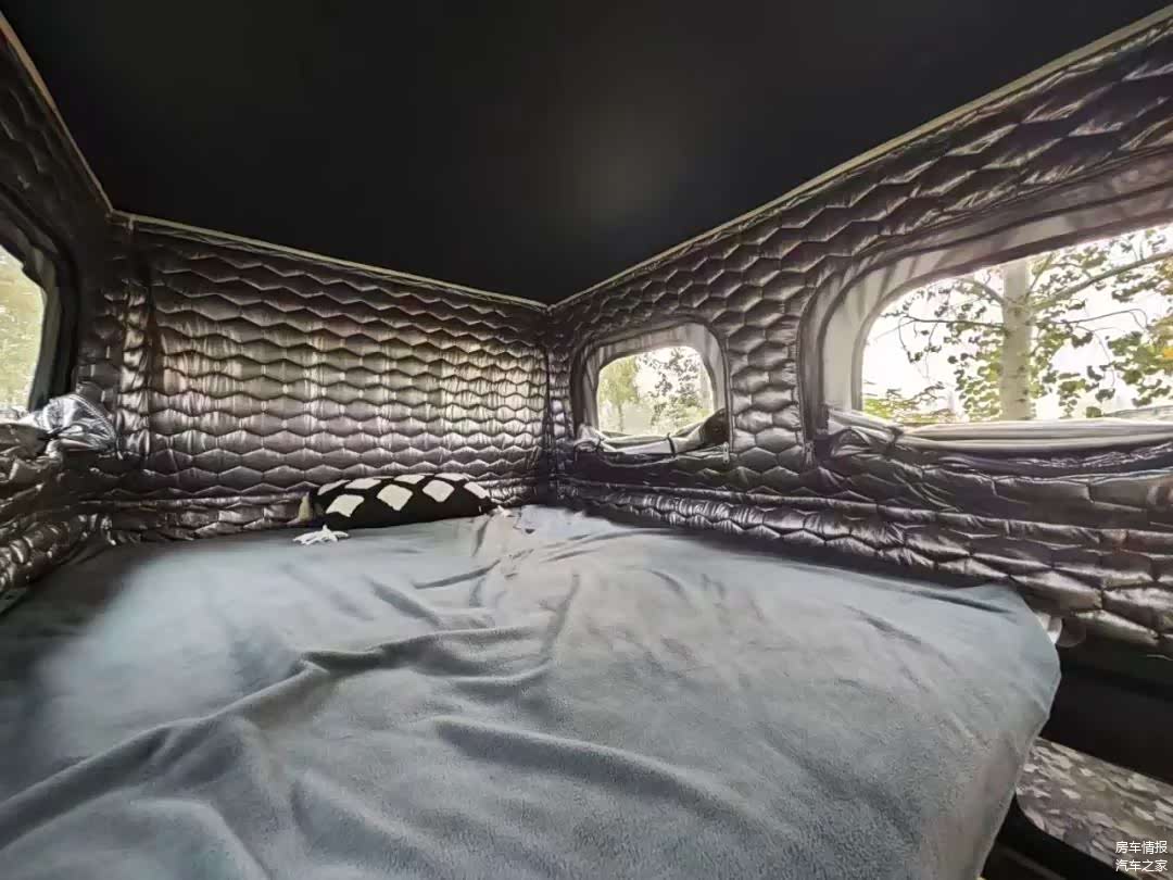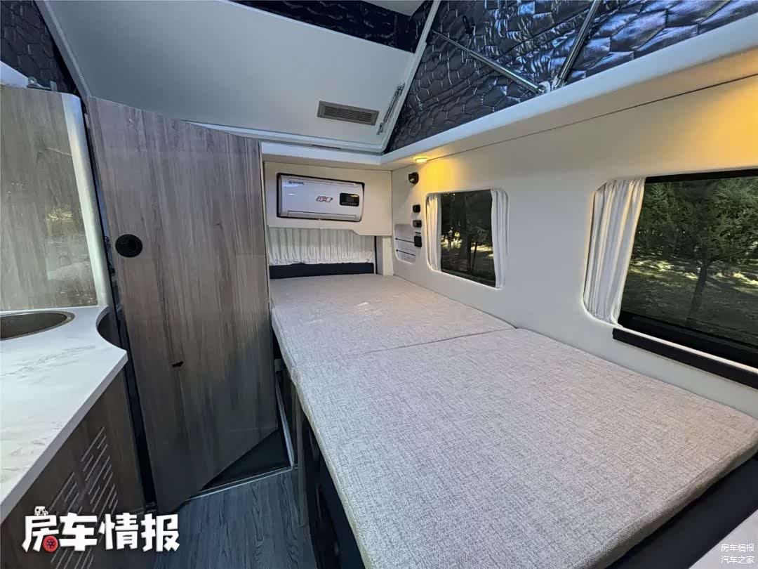 虽然采用的是低顶底盘,单内为了内部空间,车顶加入了一部电动升降顶,将车顶升起后,就会变出一张2米*1.2米的床铺,睡下两个人完全没问题。