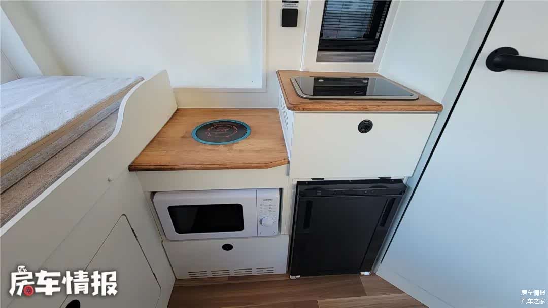 车尾部是一张可以拓展的横置双人床,最大可以拓展为1.4米的小双人床。另一侧提供了电磁炉、微波炉、冰箱以及洗菜池。