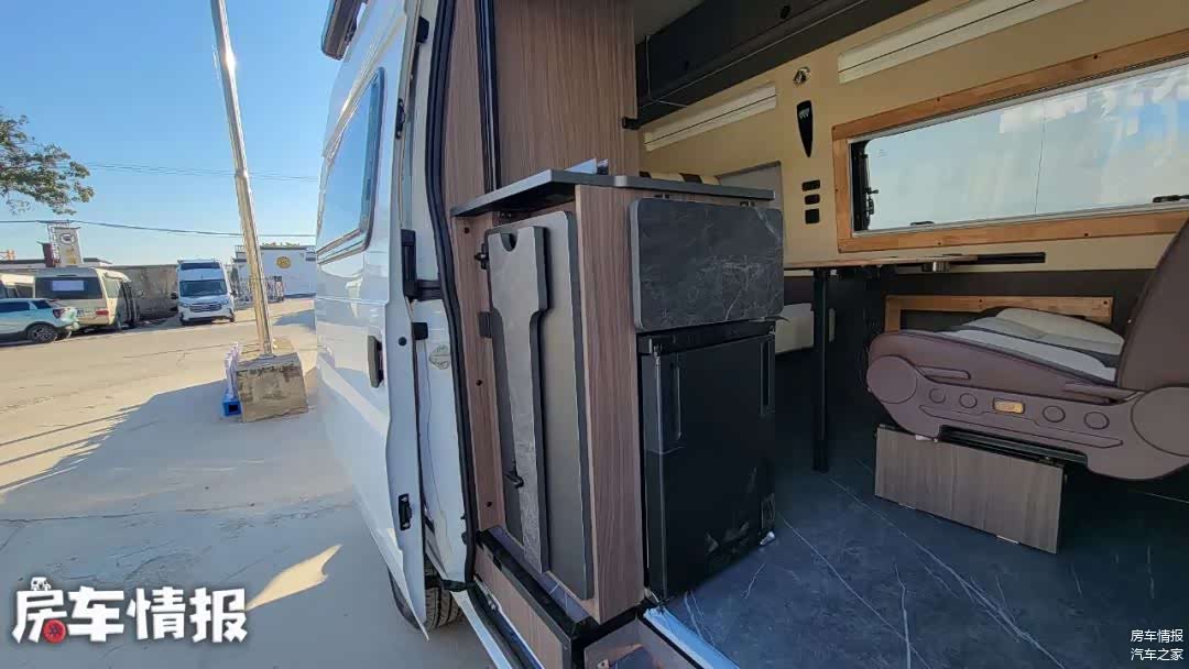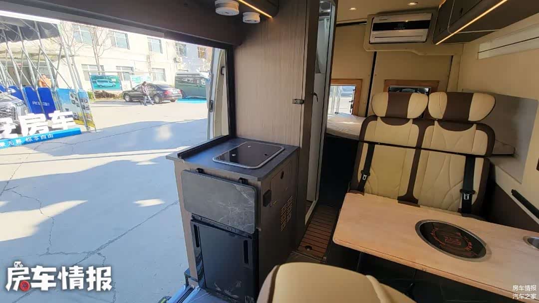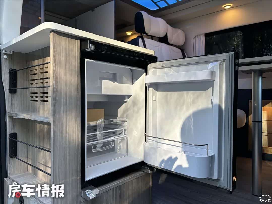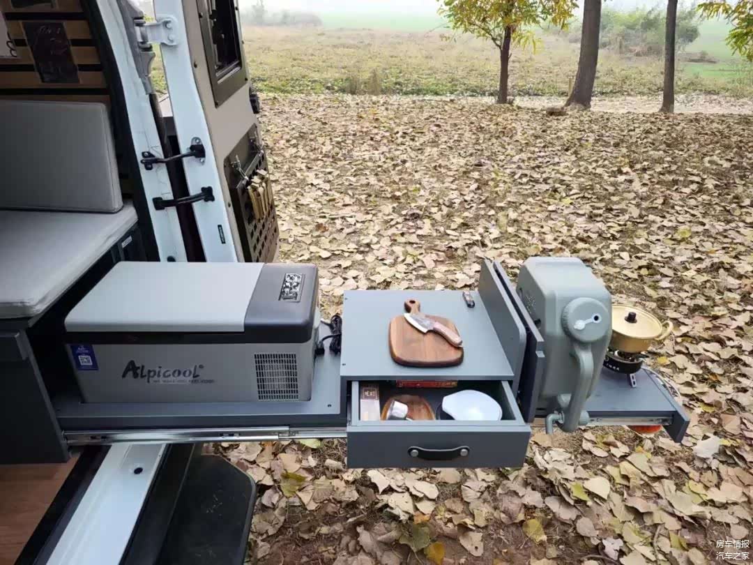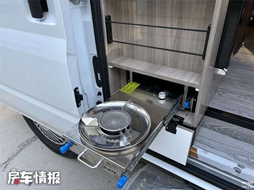 靠近侧滑门旁,设置了一组橱柜,这里提供了冰箱、洗菜池、炉灶等设备,简单在车内做饭还是没问题的。