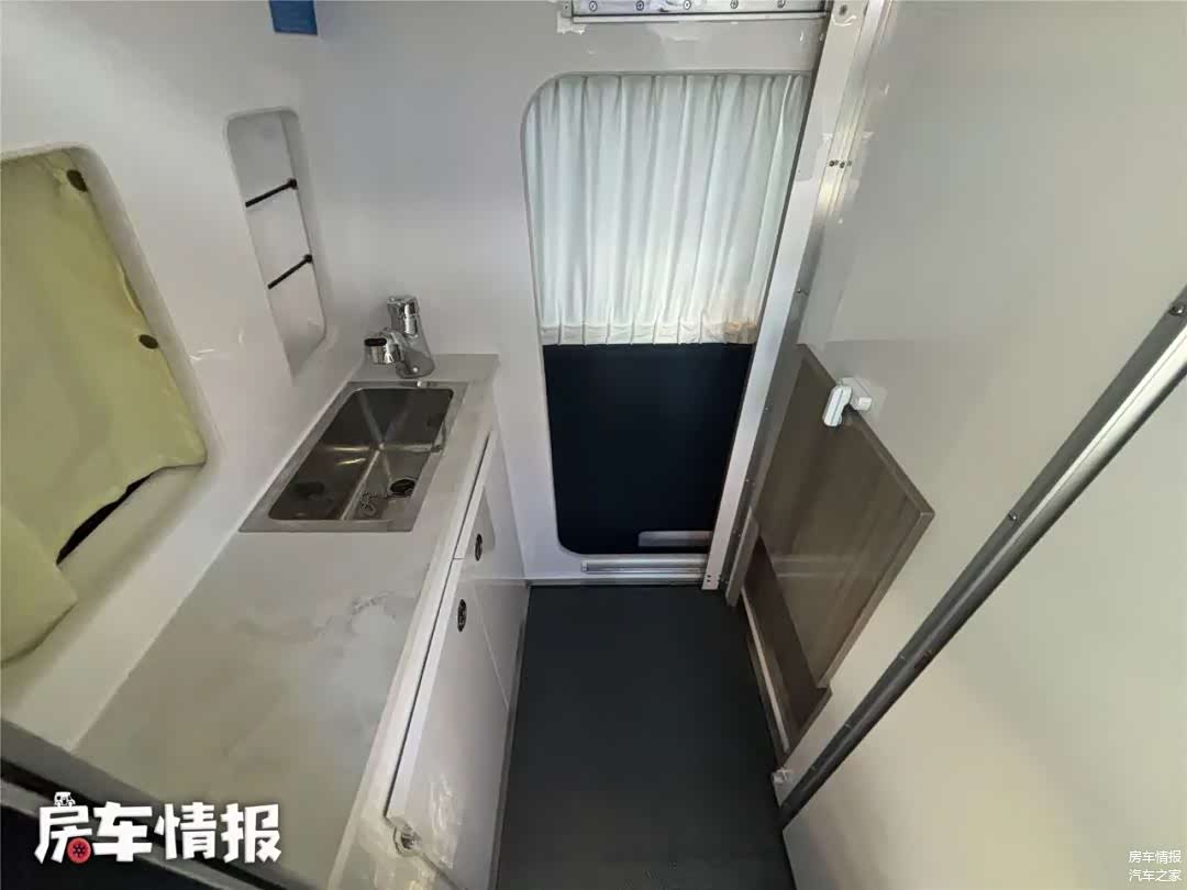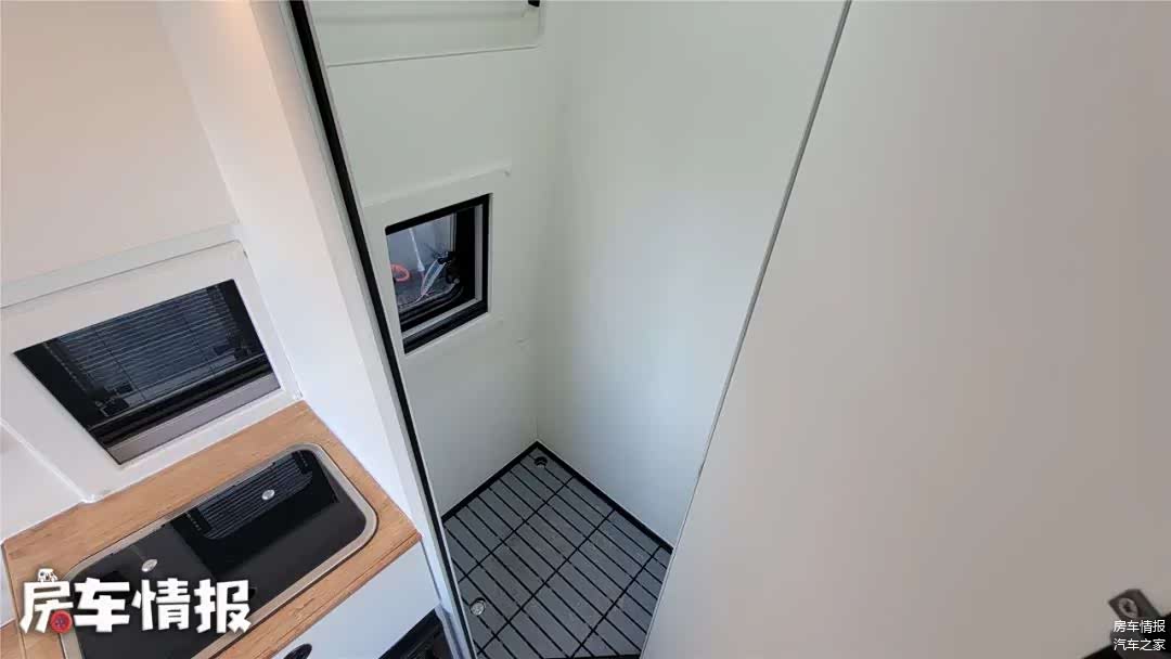 在车尾部提供了一个简单的卫生间,整体空间和主流的升顶房车相当,坐在这里简单洗漱淋浴还是可以的,万不得已的情况下,也可以借用便携式马桶在这里方便如厕。