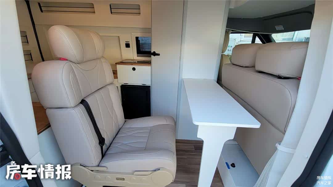 卫生间墙壁上提供了可折叠桌板,打开以后可供后排座椅使用,副驾驶座椅也可向后翻折,与后方形成对坐的形态,夜晚这里也能拼成一张长度1米9的单人床。