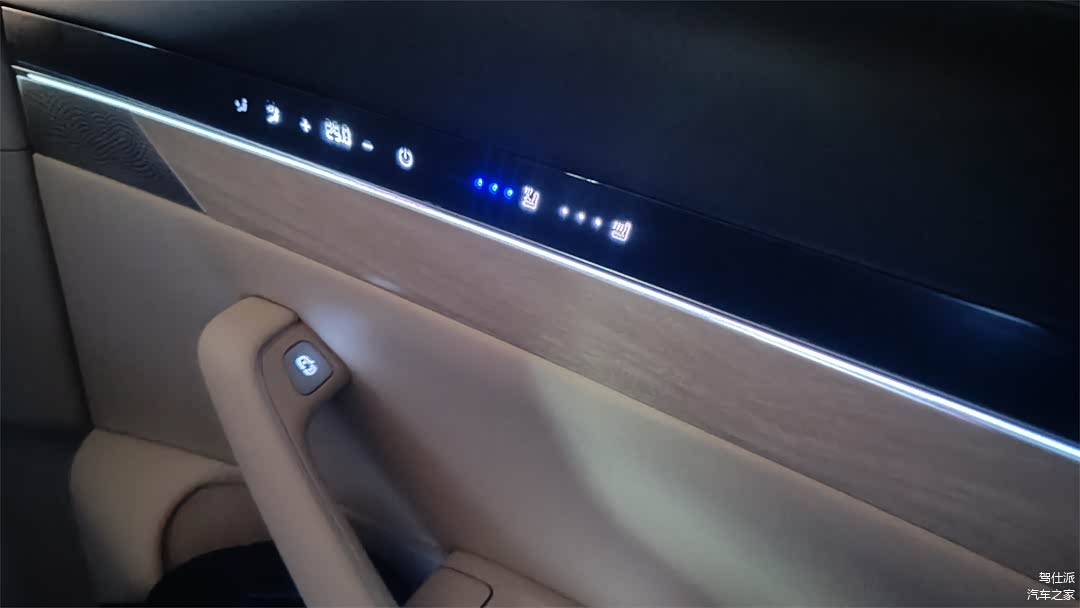 而且,左右两侧各留了一块小尺寸的触控面板,调节起来非常就手,同时有有档位、数值显示和按键的背光。个人觉得唯一的不足在于这是一整块的刚性面板,也没有颤动马达提供反馈,操作时的手感一般。