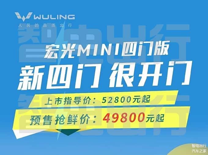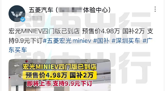 五菱体验店销售表示,第四代 宏光MINIEV(图片 | 参数 | 询价)四门版即将上市,预售价4.98万起,上市指导价5.28万起。
