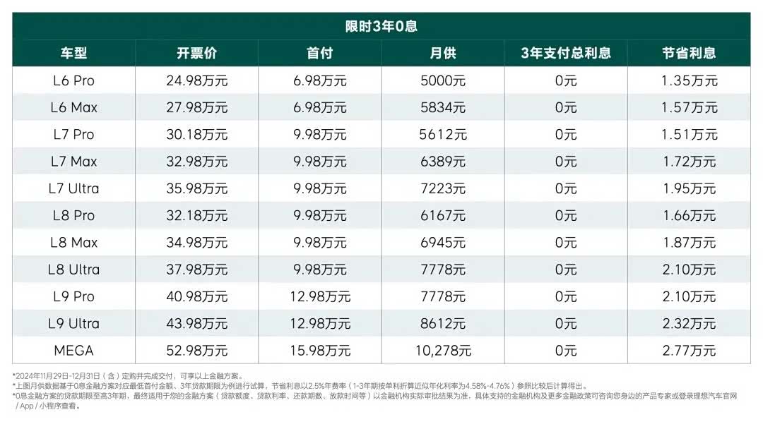 答案当然是有的,理想在11月底推出了全系限时3年0息方案,最低首付6.98万元起,0利息、0手续费,活动周期从11月29日至12月31日(含)定购并完成交付。以最入门的理想L6 Pro为例,首付6.98万的情况下,月供为5千元,虽然每个月的还款额度依然不小,但3年下来也能免掉一万多的利息,相当于变相降价了。至于选购建议,目前L6 Pro和Max的主要区别就在于后者配备了激光雷达,支持理想前段时间全量推送的「端到端+VLM」高阶智驾功能,但实际表现只能说差强人意,所以如果你对这方面没有要求的话,Pro版本的性价比无疑更高,与前文的智己相比,首付比例更加灵活。