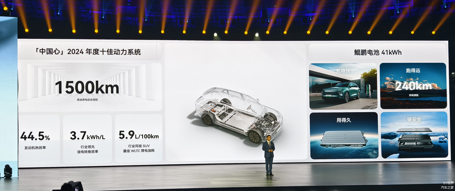 在动力方面,新车搭载了1.5T增程系统,综合续航里程可达1500公里。其配备的41.2度超大电池包,使得CLTC纯电续航达到同级领先的240公里。WLTC馈电油耗为5.9升/100公里。发动机具备行业量产最高的44.5%热效率,是专为增程系统设计的发动机,每升油可发电3.67度,并且支持加注92号汽油。