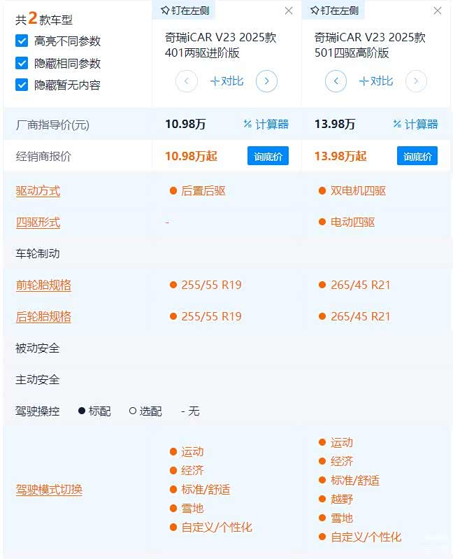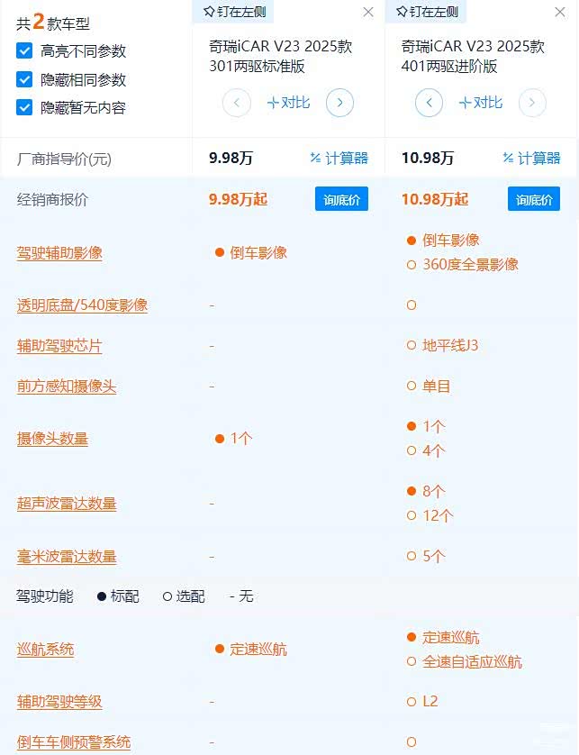 我们先来看两款两驱版本,其中两驱标准版售价9.98万,两驱进阶版售价10.98万,两款车价格相差一万元,那么配置上有何差别呢?