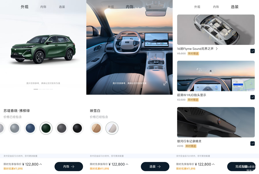 那么“决赛圈”只剩下12.28万的探索+版和13.28万的领航版。到了探索+版,不仅配置更高,选择权也更大,通过官方APP可以看到,能选的车身颜色和内饰款式都变多了,还有赠送的HUD(虽然我一直不喜欢用),对于大多数消费者来说,这个版本确实已经够用了。而顶配贵出来的这一万块钱主要用在了轮胎、氛围灯和座椅按摩上。如果资金充足顶配当然可以买,而且这些东西后期不能自己加装,座椅按摩和氛围灯更是感知相当明显,这车的座椅按摩还按屁股这你受得了吗?但15万以内的消费者对于价格的敏感度不是以“万”为单位来计算的,而是以“千”为单位,别说是1万的差价,就是3000元的差价有时候也能左右大家的决策。