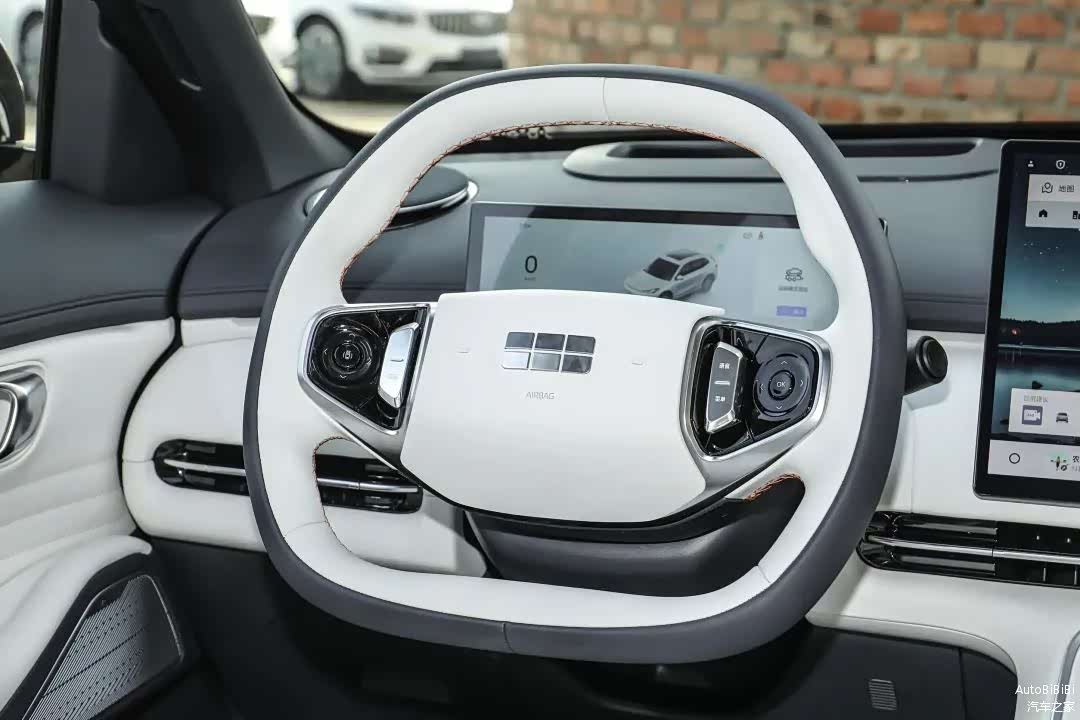 来到前排驾驶位,熟悉的银河家族式方向盘,除了此前一直吐槽的悬浮式按钮设计容易落灰外,这次我还发现这个120km入门款和次顶配及顶配在悬浮式按钮上竟然还有区别,入门款右侧下方的悬浮式按钮没有“菜单”字样,大概率功能上是有区别的,明明给了四个按钮结果就一个是没有字的,强迫症看了直接要疯。除了方向盘,50W手机无线充电上的区别对待也有点膈应人,毕竟9.88万的星愿上都有的功能到了这台11.28万的星舰7上还要砍掉,那目的就很明显是为了“劝”消费者多加1万上更贵的版本。