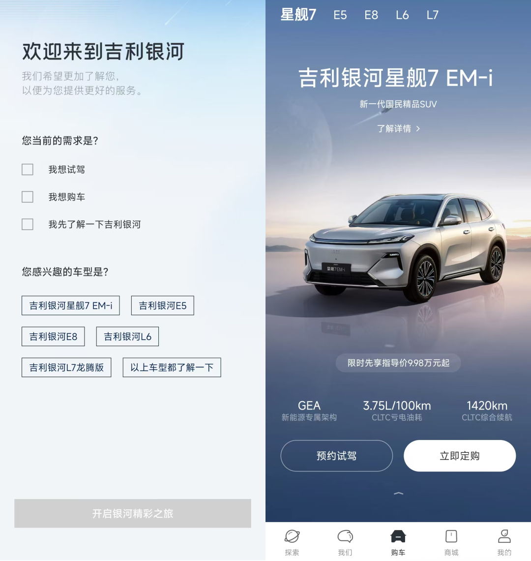 在开始正式聊车之前,我先说一个奇怪的现象,就是星舰7这台车的销售渠道很诡异。怎么个诡异法呢?这车线下是和星愿一起被放在几何的门店里销售,由于几何被整合进了银河,因此,他们的门店重新装修,和银河用上了相同的标识。这其实挺好理解的,但是当我打开之前预定星愿时候使用的吉利汽车APP,发现里面没有这台车。而打开吉利银河APP弹出的是这样一个看起来像问卷调查,但实际上是“强迫”你了解银河汽车的界面,而且不点这里的选项就不让进入下一步,着实有些恶心人,进入首页以后可以看到星舰7被放在了最显眼的位置,这个APP里除了星舰7,还有其他已经推出的银河车型。种种迹象表明,星舰7是银河“收编”几何之后首款放在几何销售渠道出售的车型。那么下一步,不知道几何和银河是否会像比亚迪的海洋网和王朝网一样,在不同的价位段用相同品牌名称的两款“兄弟”车型拓展市场。