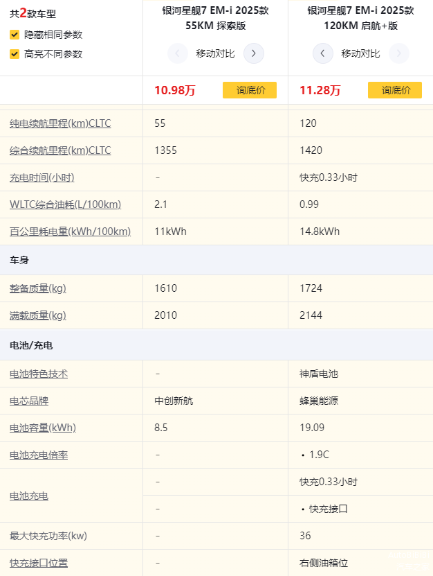 简单粗暴的结论就是,最值得买的肯定是12.28万的探索+版。首先,55km启航和120km启航+这两个入门款没有座椅电动调节、没有座椅加热通风、没有手机无线充电,甚至连电尾门都没有,可以直接排除。那么还剩下3个配置里面还得排除55km探索版,这个版本最大的问题是电池太小,如果你像我一样每天上班要开50km,要么就得天天充电,要么就干脆直接告别纯电模式当个燃油车开,但是不管是馈电行驶还是频繁充电,对电池来说都不是什么好事,更何况小电池的电池供应商也不一样,还没有快充功能。