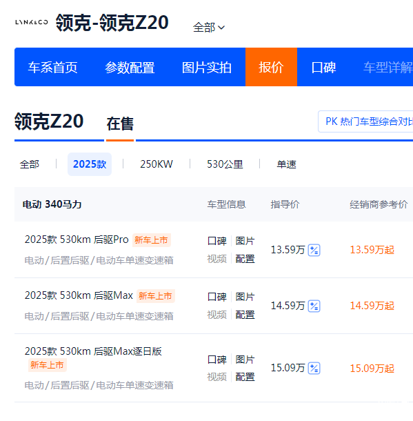 领克Z20的最大亮点之一便是它的性价比。预订价从14.6万元起,顶配版售价也只需16.1万元,这个价格在同级别的电动车中算是颇有竞争力了。比如,特斯拉Model Y和宝马iX1的价格都要高出不少,而Z20的性能、配置和设计完全不逊色于它们。而且,Z20几乎全系标配了很多实用的配置,如全景天窗、座椅加热、智能驾驶辅助系统等,性价比较高。