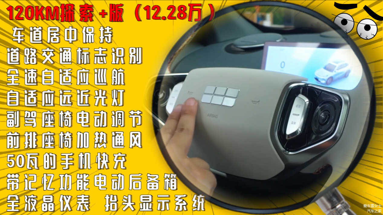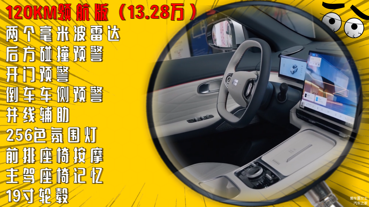 顶配的领航版,价格上又贵了1万。多了两个毫米波雷达,所以说主动安全配置更丰富,像是后方碰撞预警、开门预警、倒车车侧预警、并线辅助等功能都有了。还多了256色氛围灯、前排座椅按摩和主驾座椅记忆功能,轮毂也升级为19寸。配置上锦上添花,不差钱的朋友可以考虑,但是你要是预算没那么多,中配的探索+版,体验感受相对高配也不会差太多。因此120千米续航的探索+版,才是主流消费者的主流之选。