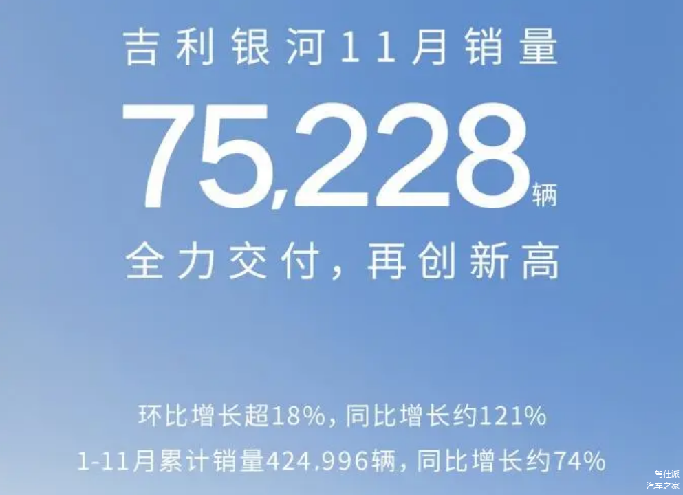 在三款新车的带动下,吉利银河11月销量达到75228辆,再创历史新高,同比大增约121%;1-11月累计销量近42.5万辆,同比增长约74%,成为销量增速最快的“大厂新能源”。