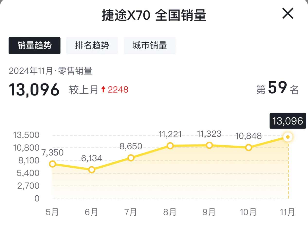 这几年经济形势不好,很多人都有点消费降级的意思。所以虽然新车型推出的很多,但反而是老的车型比较热销。像是轩逸、逍客,就是经典款卖得比较好,帕萨特、迈腾都推出了新款,但还是老款车型更畅销。捷途X70也是一样的,它现在是捷途品牌的销量支柱产品,11月份卖了13,096辆。虽然也推出了捷途X70 PRO和PLUS版本,但卖的最多的还是老款的捷途X70。一是因为价格便宜,二是因为上市多年,质量相对稳定。
