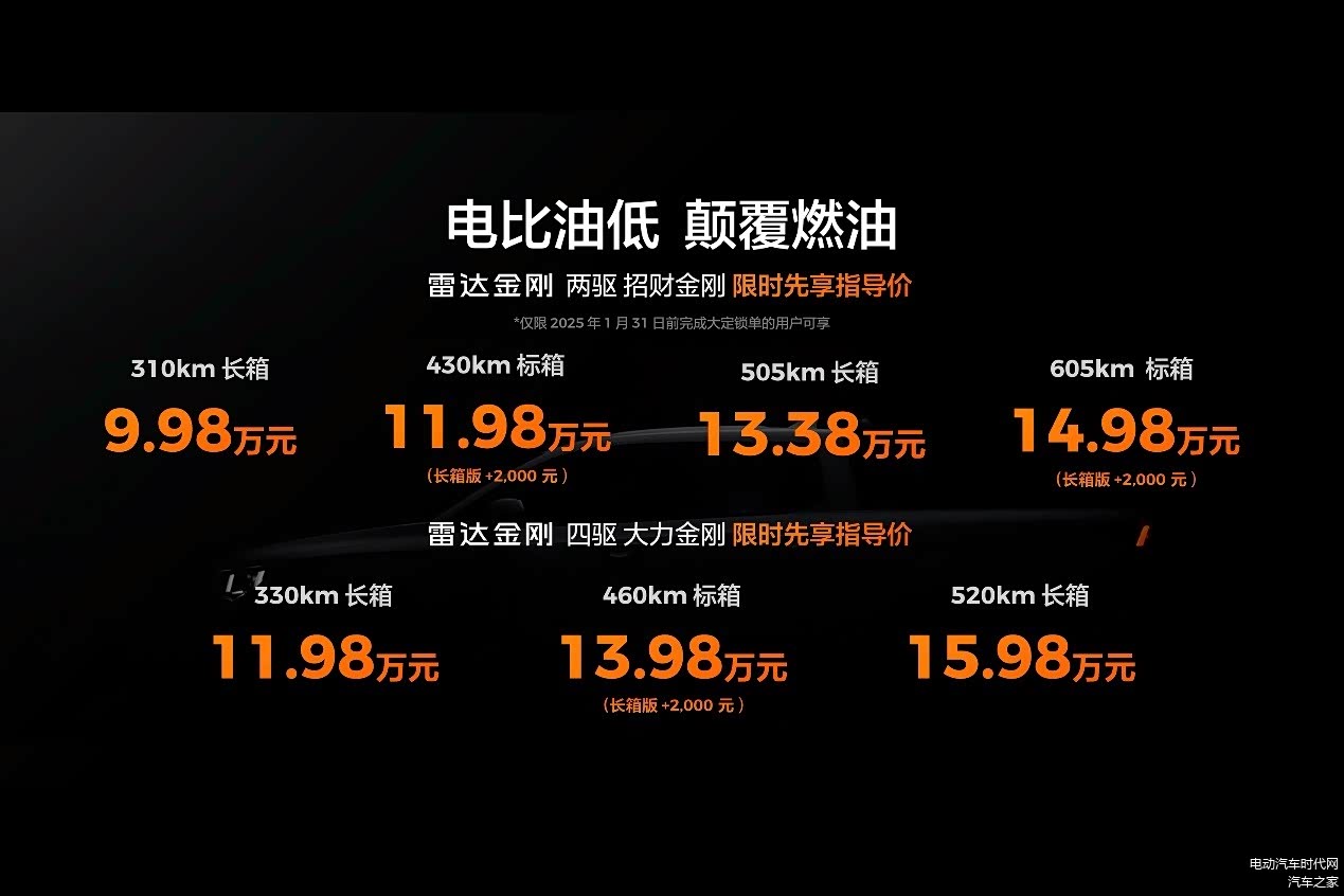 12月23日,定位全球商乘两用纯电皮卡的 雷达金刚(图片 | 参数 | 询价)正式上市。2025年1月31日前锁单的用户,还可享受限时先享指导价。两驱版招财金刚 9.98万元起;四驱版大力金刚11.98万元起。雷达金刚以电比油低的方式,颠覆传统燃油皮卡,既是一台最具动力颠覆、省钱颠覆、操控颠覆、安全颠覆的纯电皮卡,价格又极具竞争力,是一台十万级最值得买的纯电皮卡。