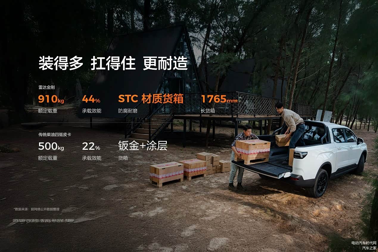 装载方面,雷达金刚装得多、扛得住、更耐造,是名副其实的“拉货扛把子”。货箱长度达1765mm,容积约为1400L,无论是商业建材、还是农产品都能轻松容纳。额定载重达到910kg,比燃油皮卡高约400kg。承载效能同样高达44%,比传统燃油皮卡高出2倍。这主要源于雷达金刚采用与特斯拉Cybertruck同类型的一体化笼式内骨骼的车身技术,以及隐藏式大梁,车身具备双纵梁及12根大截面的嵌入式横梁,更轻的车身,却有更高的强度和刚度,面对碰撞和冲击时,可以得到更可靠的保护。