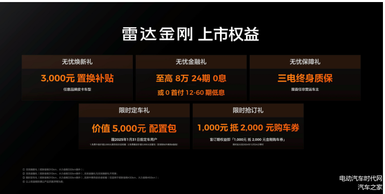 本次发布会,吉利雷达还推出了专属上市权益,包括三电终身质保、至高8万24期免息(或0首付12-60期低息)、3000元置换补贴的无忧三重礼(置换补贴与金融贴息二选一),以及还有价值5000元的限时定车礼、1000元抵2000元的限时抢订礼。