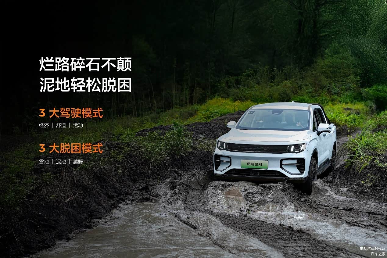 驾驶模式方面,雷达金刚还拥有经济、舒适、运动三大模式,以及雪地、泥地和越野三种脱困模式。无论面对任何极端路况,都能凭借毫秒级的扭矩响应迅速脱困,为用户带来前所未有的脱困能力。