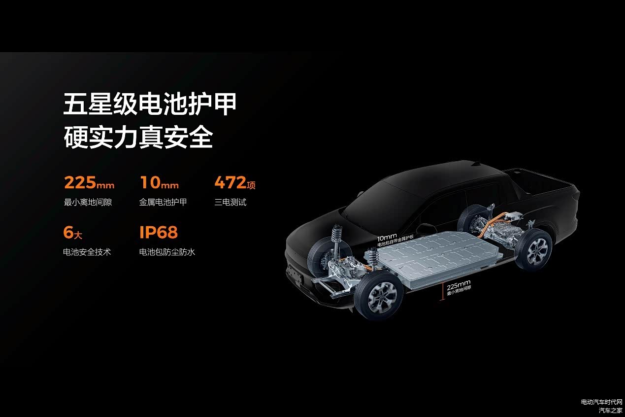 商用皮卡使用环境恶劣,用户对电池刮碰有着很大顾虑。雷达金刚离地间隙225mm,电池包护甲厚达10mm,这是很多乘用车的5倍以上,避免剐蹭也不怕剐蹭。电池包经过多达472项的严苛测试标准,如挤压、撞击、针刺、浸水等测试,远超国际标准。即便在复杂的路况下,也能有效避免电池底部的刮碰风险。同时,共享大吉利的电池安全技术标准,拥有6大电池安全技术,与IP68级的防尘防水能力,在涉水、暴雨等恶劣天气下,依然保持稳定。
