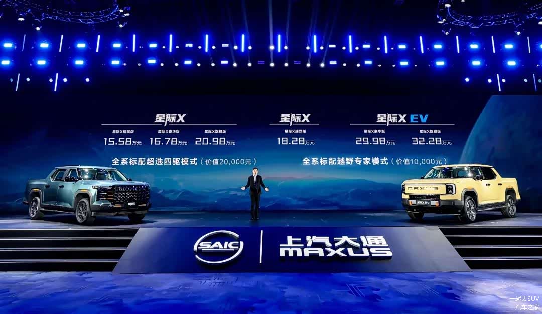近日,上汽大通全新皮卡—— 星际X(图片 | 参数 | 询价)正式上市发售,价格15.58-32.28万元,其中,燃油版车型搭载SC25TA型2.5T柴油发动机,共推出4款车型,售价15.58-20.98万元,纯电动版搭载前后双电机,共推出2款车型,售价29.98-32.28万元。