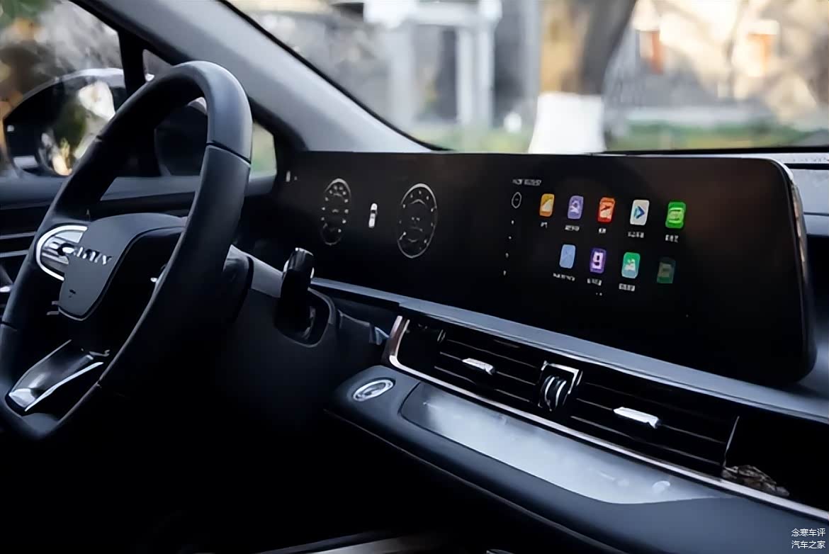 这个屏幕后面是Lion 5.0 AI科技智慧座舱,支持双区域智能语音识别控制,还能跟苹果CarPlay和华为HUAWEI HiCar无线互联,用起来挺方便的。