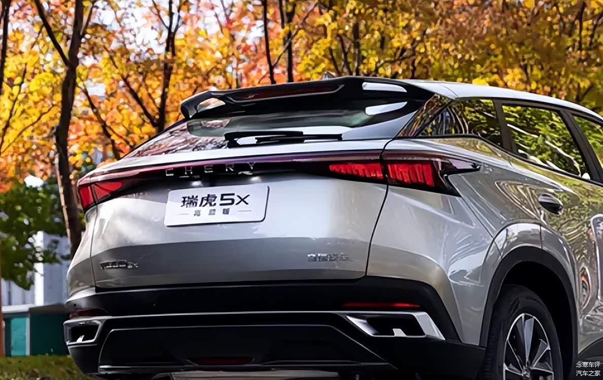 车尾部分,后保险杠的设计做了调整,加了贯穿式的镀铬条和排气装饰,看起来更精致了。尾门左下角“TIGGO 5x”的标识,也表明了这车的身份。
