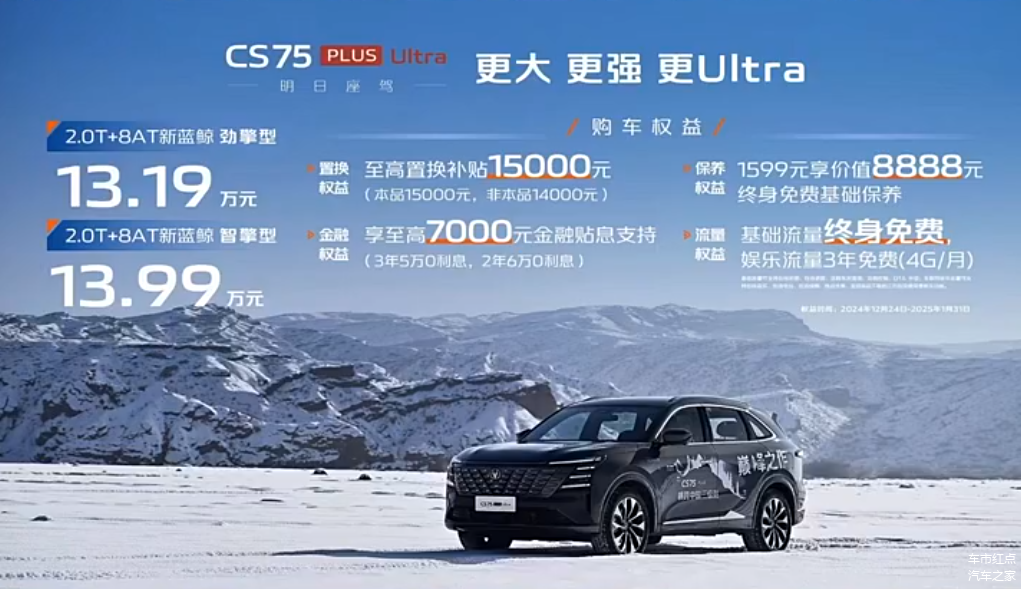 12月24日,长安第四代CS75PLUS Ultra正式上市,新车共推出2款配置,售价13.19-13.99万元。