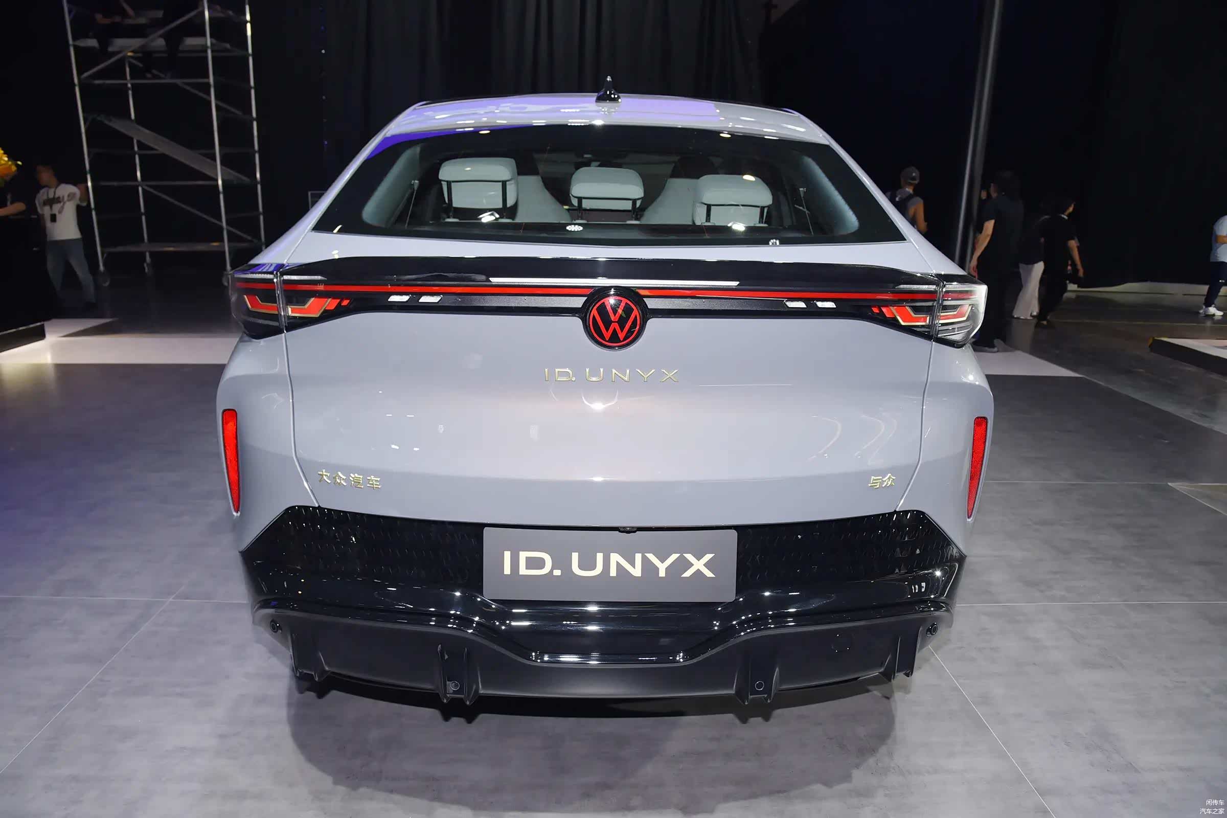 大尺寸轮毂也有着独特的造型,配合侧裙处的黑色装饰,提供了运动和跨界的感觉。在车尾部分,贯穿式的尾灯位于很高的位置,内部光源造型个性,上方有着高高翘起的小尾翼,大掀背式的尾门中间凹陷,镶嵌有大众车标和ID.UNYX金标,显示了尊贵的身份,后保险杠部分再度突出,加入了夸张的扩散器装饰和黑色面板,让整车的风格形成统一。在内饰部分,新车同样个性,除了大众新一代车型标配的悬浮式大尺寸液晶屏,全新的车机,线尺寸的仪表盘和Hud抬头显示之外,采用了独特的展翼式中控台面。
