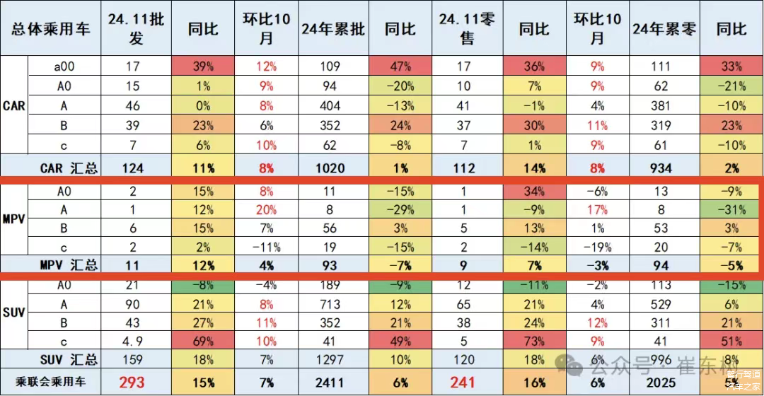 据乘联会数据,2024年1-11月,国内乘用车市场零售销量为2025.7辆,同比增长4.7%,但同期MPV累计零售销量94万辆,同比下滑了5%。