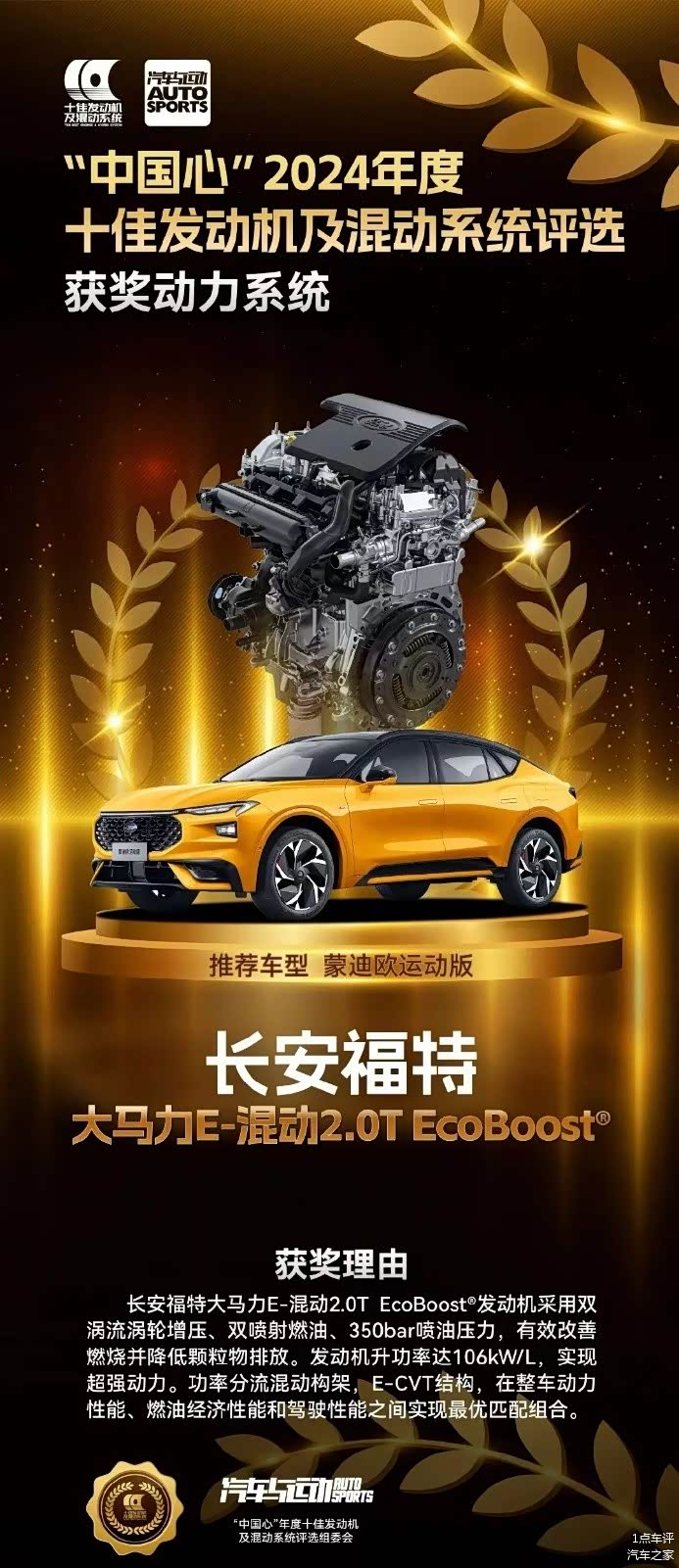 高能低耗的发动机是大马力E混动系统高效运行的关键所在,以蒙迪欧运动版为例,其搭载了第五代2.0T EcoBoost双涡流涡轮增压发动机及成熟可靠的动力分流技术,该发动机是“沃德十佳发动机”的常客,采用双涡流涡轮增压、双喷射燃油、350Mpa喷油压力,燃烧更充分,动力更强劲。凭借在动力性和经济性方面的均衡表现,蒙迪欧运动版搭载的这套大马力E混动系统蝉联“中国心”年度十佳发动机及混动系统,系统综合功率高达308匹马力,实测零百加速5秒级,性能达到同级天花板级别,同时油耗也不高,高速段工况油耗仅4.64升/百公里,真正让用户“开着爽用着省”。