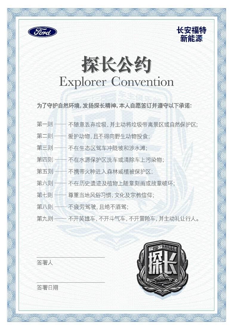 吸引用户容易,让用户产生共鸣并转化为粉丝并不是件易事,这首先需要企业确定目标用户群体,找出优势和差异,进而满足目标用户的需求,而这也是其赢得用户认可的先决条件。作为一款历经34年6代进化的经典车型,福特探险者车主有着高度清晰的用户画像,他们不仅热爱探索、勇于挑战,同时非常具有社会责任感,愿意为社会尽一份责任和担当。基于这样的洞察,2021年长安福特为福特探险者车主打造了专属用户圈层和共创体验平台“福探长行动”,呼吁大家签署《福探长公约》,成为“福探长”。“福探长行动”致力于给用户创造独特且有意义的体验,带他们走别人不敢走的路,去看别人看不到的风景,做前人没做过的事,一起去有担当地“野”。