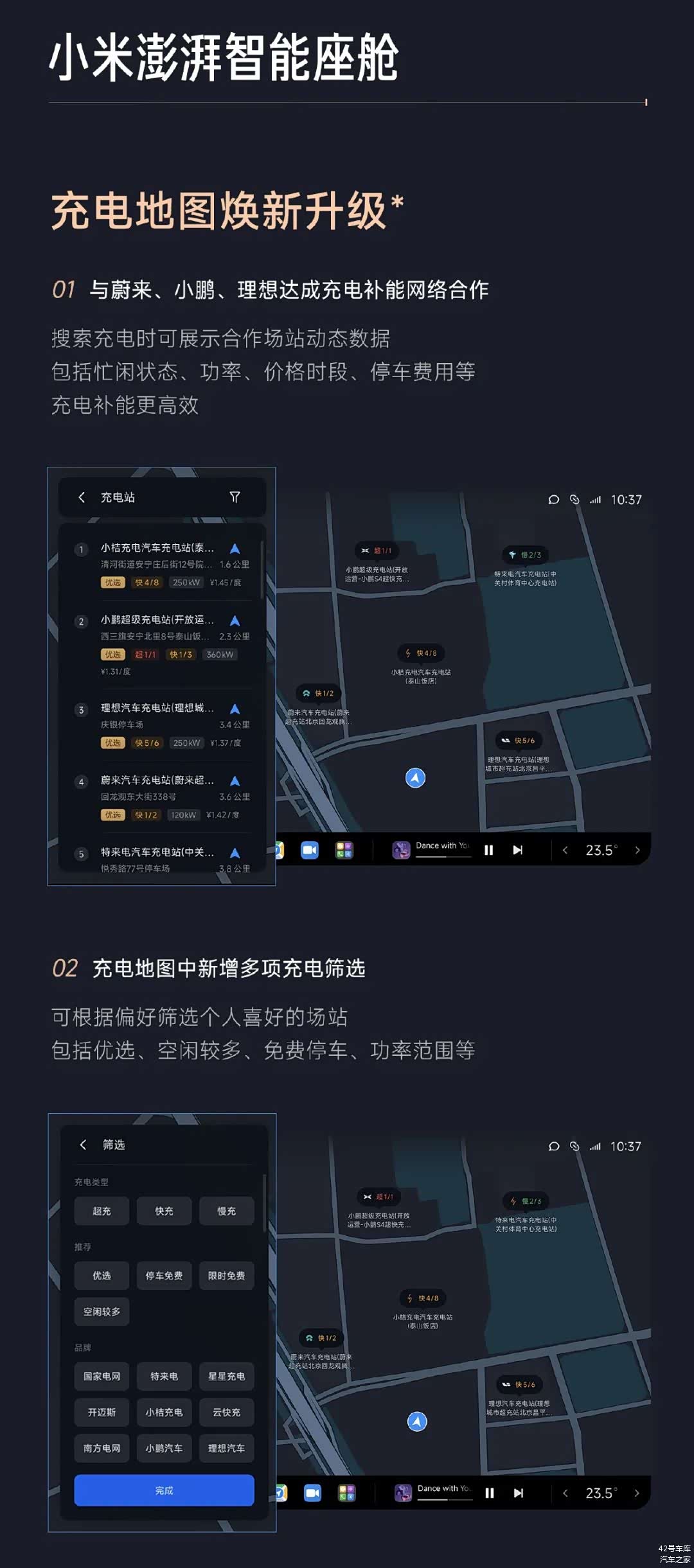 在智能座舱方面,小米 1.4.5 版本中充电地图是最大的更新之一。其中,小米与蔚来、小鹏、理想三个品牌达成了充电补能网络合作,小米车主可以在车机屏幕上搜索合作场站的动态数据,包括充电桩忙闲状态、充电功率、充电价格时段、停车费用等,用户可以在车机上选择,高效补能。同时,用户还能在充电地图上根据偏好筛选充电站。