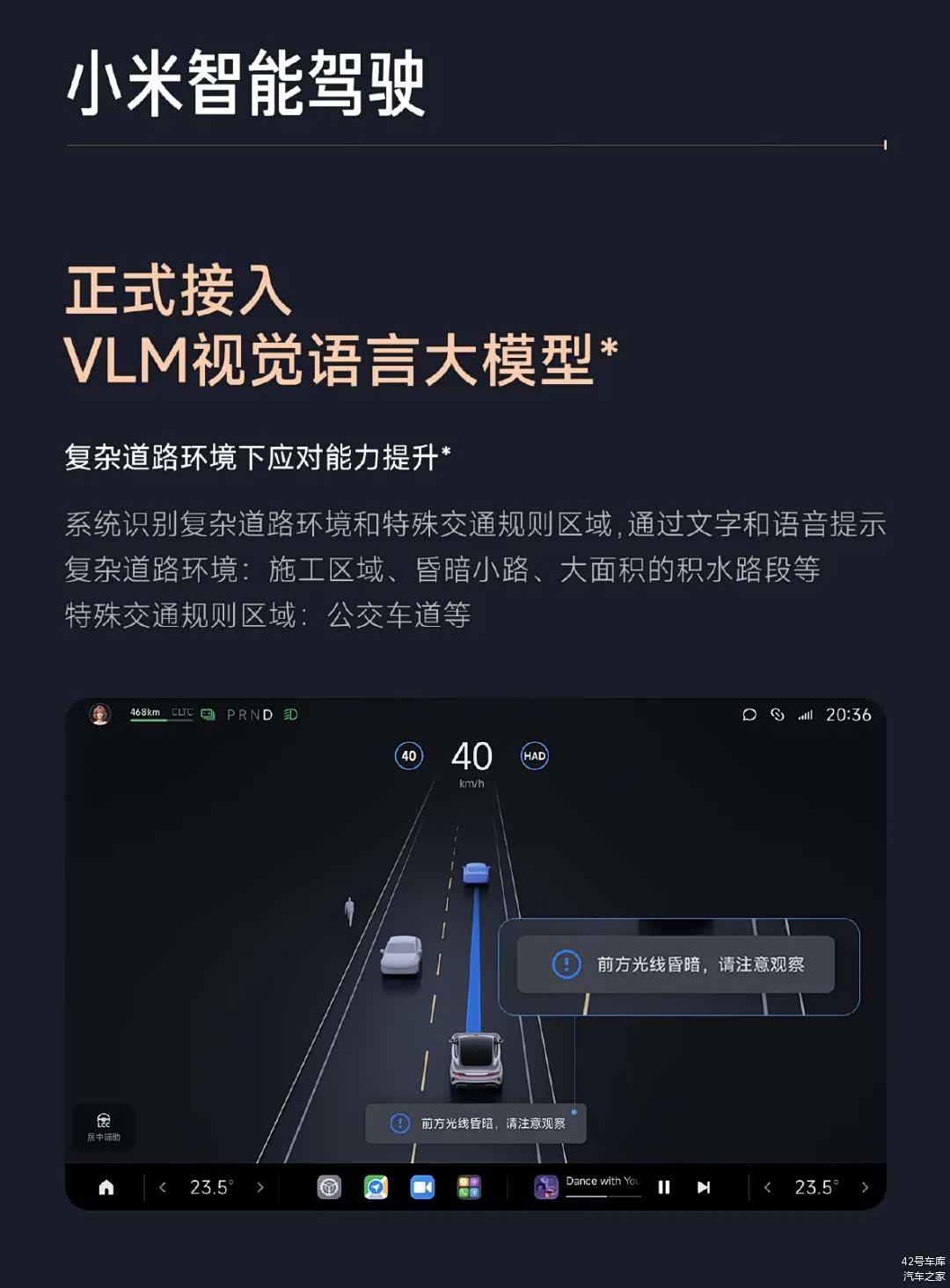 VLM 视觉语言大模型全称为 Vision-Language Model,当系统识别到复杂道路环境和特殊交通规则区域时,通过文字和语言提示复杂道路环境。目前,小米汽车的 VLM 支持施工区域、昏暗小路、大面积的积水路段等复杂道路环境,以及公交车道等特殊交通规则区域。
