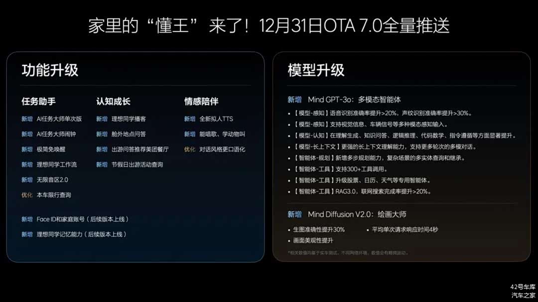 12 月 25 日 - 27 日,理想汽车连续三天推出「2024 理想 AI Talk」。在这三天的直播中,理想汽车宣布了对人工智能最新的思考,以及智能驾驶和理想同学在内的人工智能技术的最新进展,并宣布基于自研基座大模型 Mind GPT 的理想同学从车机进入手机,App 已于 12 月 27 日上线各大应用商店。此外,理想汽车宣布 OTA 7.0 版本车机系统将于 12 月底全量推送给 AD Max 用户,新增 AI 推理可视化、高速端到端等功能,并实现 Mind GPT-3o、Mind Diffusion V2.0 的能力升级。