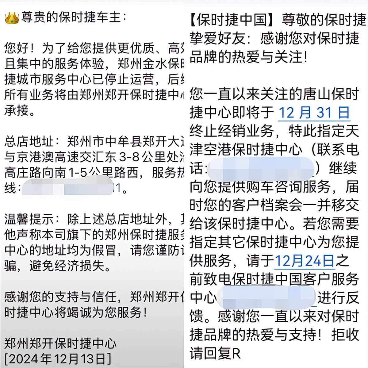2024年的最后一天,郑州的保时捷车主田先生听说了两个消息:首先,他经常去保养的郑州金水保时捷城市服务中心已于12月停止运营,后续业务将由郑州郑开保时捷中心承接;其次,买车时承诺的三年新车礼也取消了;最后,“听说保时捷的‘凌驾风雪’试驾活动也取消了。”田先生说。