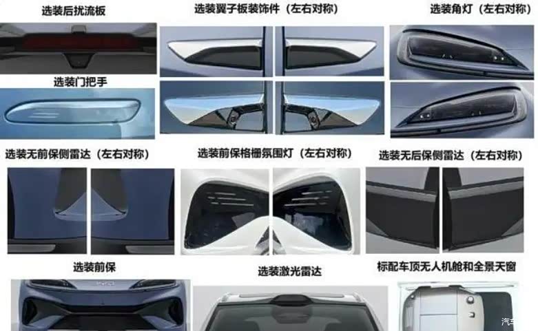 前脸部分为封闭式低风阻设计,两侧犀利的LED头灯组通过灯带相连,增加辨识度。下方前包围疑似配备了主动开闭式进气口,有利于提升续航,两侧设计了风道。另外,车顶配有激光雷达,支持高阶智驾。