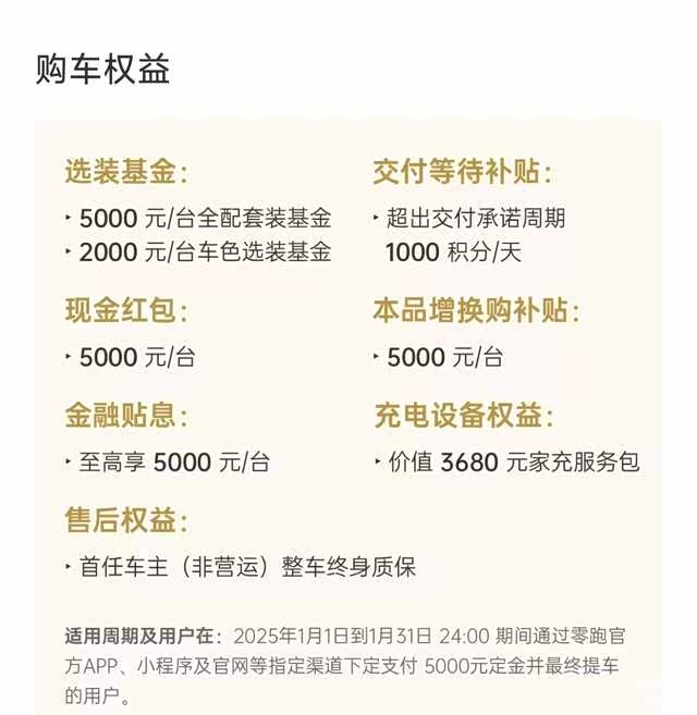 在宣布完成年度目标的同时,零跑的2025年1月购车权益也出来了,首先是5000元一台的现金红包,然后是5000元的选装基金,还有2000元的选色基金,本品增购补贴还有5000元。