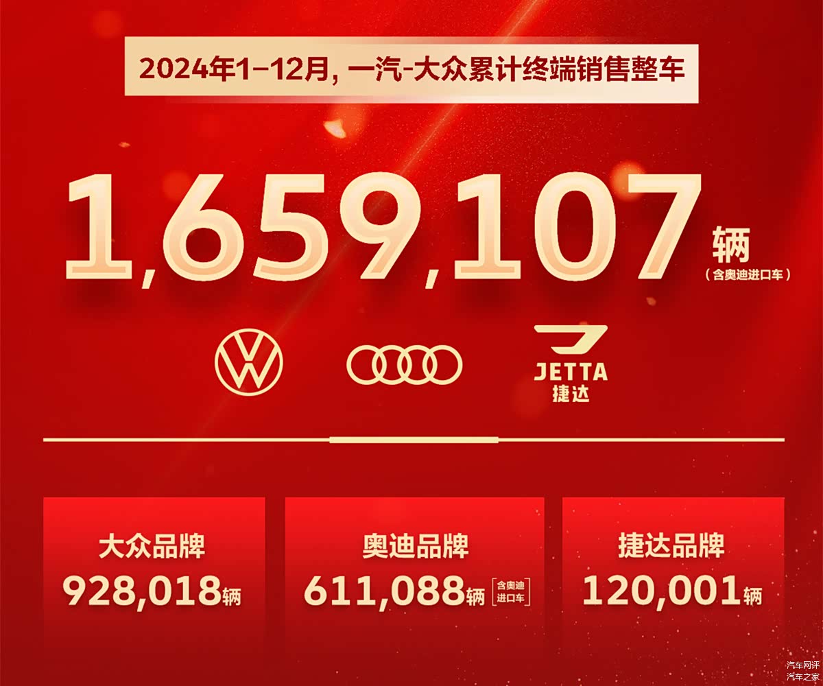 对各大合资品牌而言,2024年是压力比较大的一年,自主品牌凭借新能源、智能化方面的优势,逐步抢占合资品牌原有的市场份额。就在2024年最后一天,一汽-大众发布了全年终端销量数据,整体维持着较强的实力。
