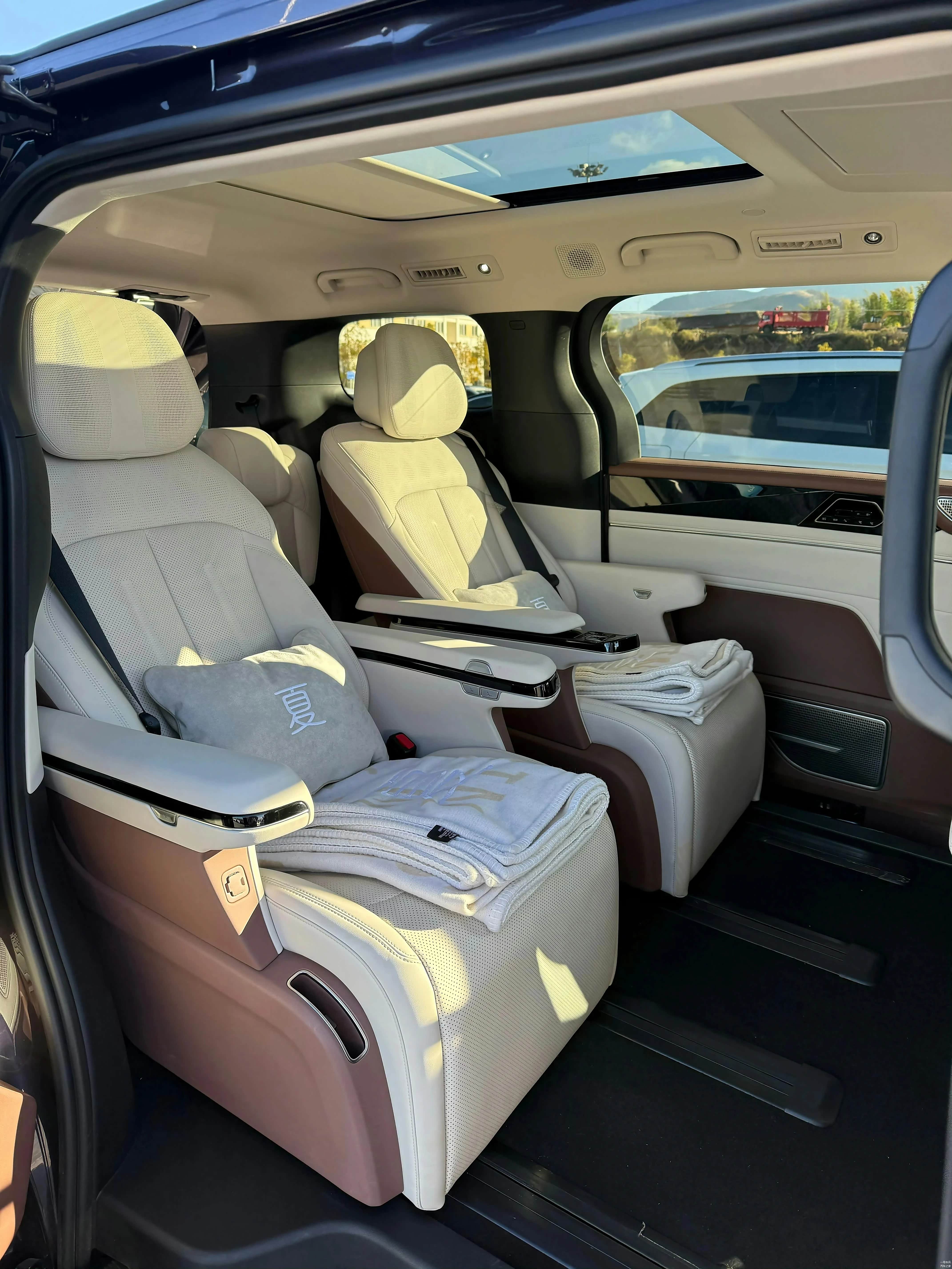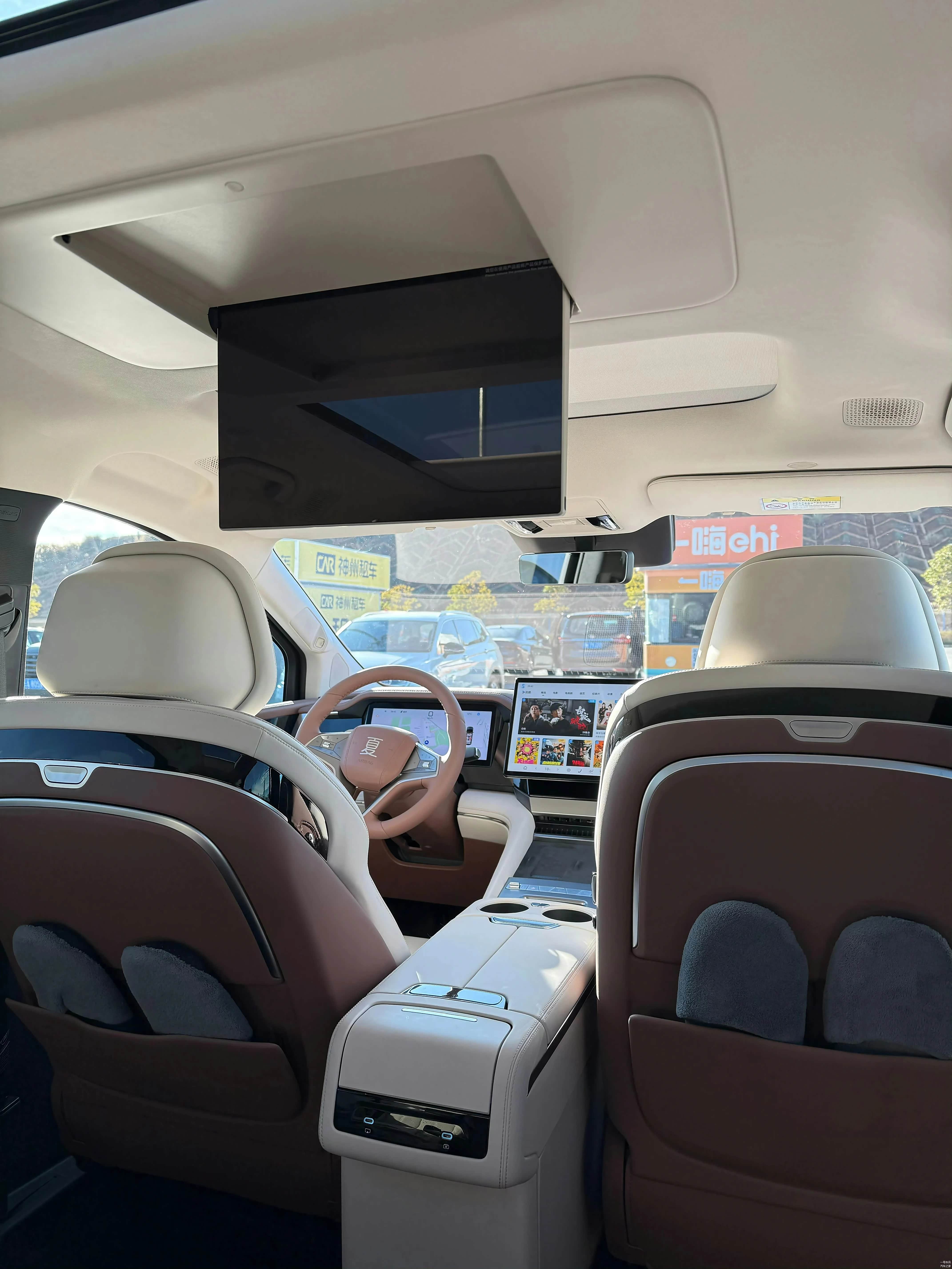 这款车的内部装饰采纳了2+2+3的7座位布局,而在第二排,它还搭载了Nappa真皮制成的双独立超柔云感座椅。另外,后排座椅的底部还配置了带有温度感应器和音乐播放装置的车载空调。这组座椅不仅装备了电动调节、电动腿托和通风/加热/按摩等功能,还可以通过内部扶手进行控制,同时门板的位置也配备了按键和拨杆。后排座椅的靠背是可旋转式的,并且具有自动调角机构。前排座椅的尾部设计了一个可折叠的小桌板,并配备了15.6英寸的吸顶屏、车内的冷暖冰箱和双天窗等功能,以确保乘客能够享受到舒适的乘坐体验。后排座椅则为可折叠式结构,并且配有智能语音识别装置。除此之外,该设备还将配备“迪声”28扬音响系统和Hi-Fi音乐头枕,同时还将提供可拆卸的户外蓝牙音箱功能。