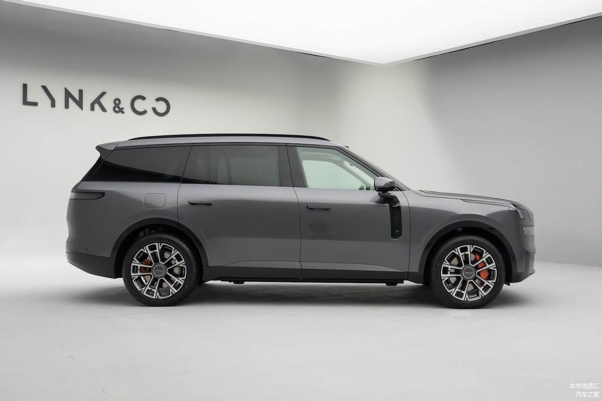 从侧身来看,领克900的挺拔感很显著,而且车辆所采用的悬浮式车顶结构看上去会比当前市场中的豹8、理想L8等车更极致,究其原因,就是因为车辆通过Flush Door 2.0工艺实现了在同一平面内打造所有车身支柱结构,而且配合无框外后视镜、隐藏式电动侧门把手、扁平式车顶行李架,还有与车身面板同处一个平面的尾灯,领克900讲究的就是一个一气呵成,也会有利于风阻的下降、下压力的提升。
