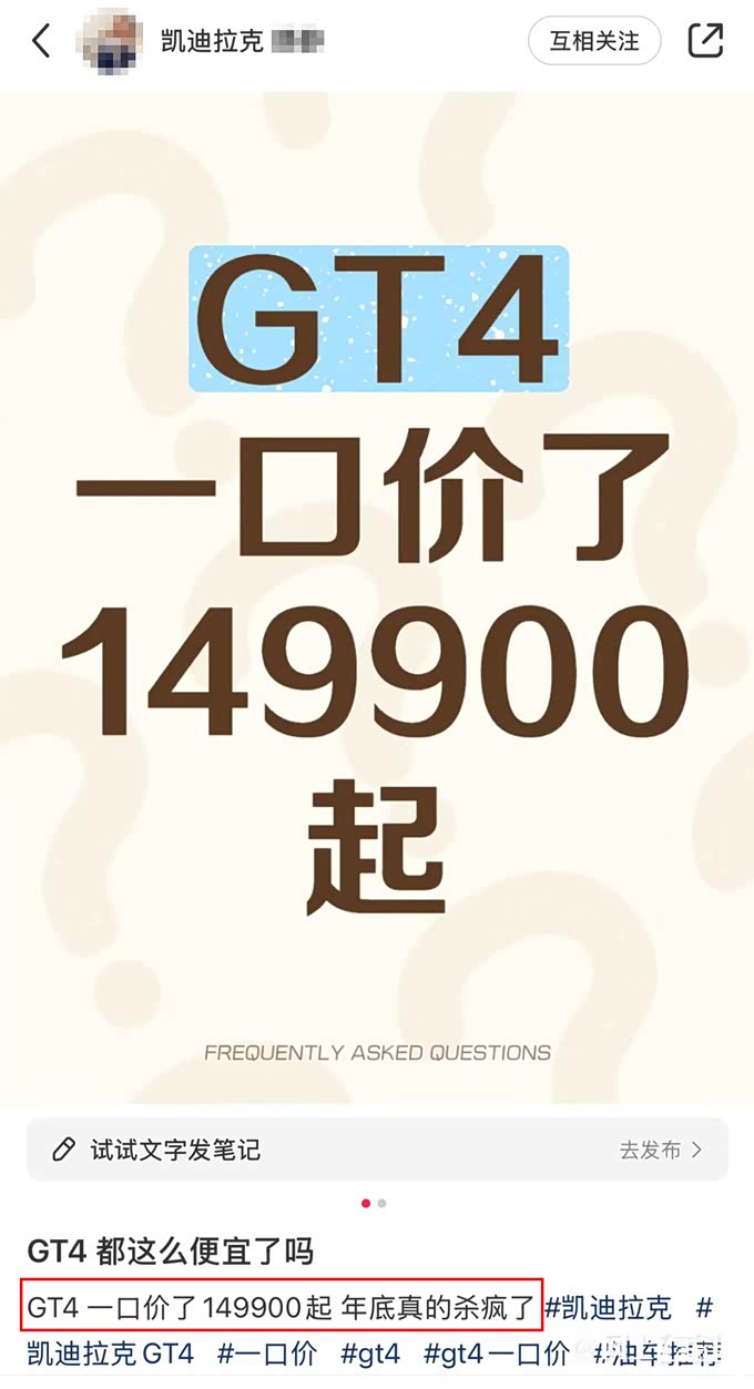 “GT4一口价了,14.99万元起,年底真的杀疯了”。凯迪拉克销售在社交平台发文说道。