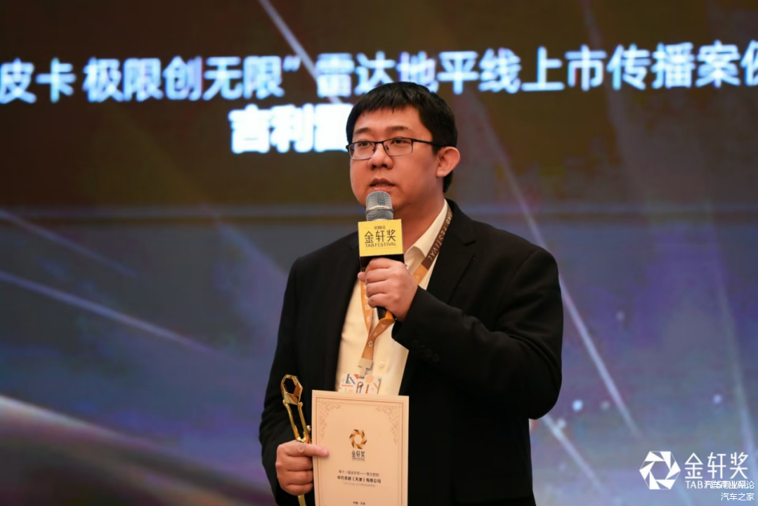 领取营销创新团队奖的广汽丰田市场营销部公关科科长张赓,感谢组委会能够在开年就把这样一个非常专业的大奖颁给广汽丰田。他说,正如刚才有老师盛赞广汽丰田去年做的一些工作,广汽丰田在无比内卷的过去一年,在营销打法,包括传播创新、跨界营销方面做了一些工作,非常荣幸能够被专家评委看到、关注到,拿了这么一个大奖。