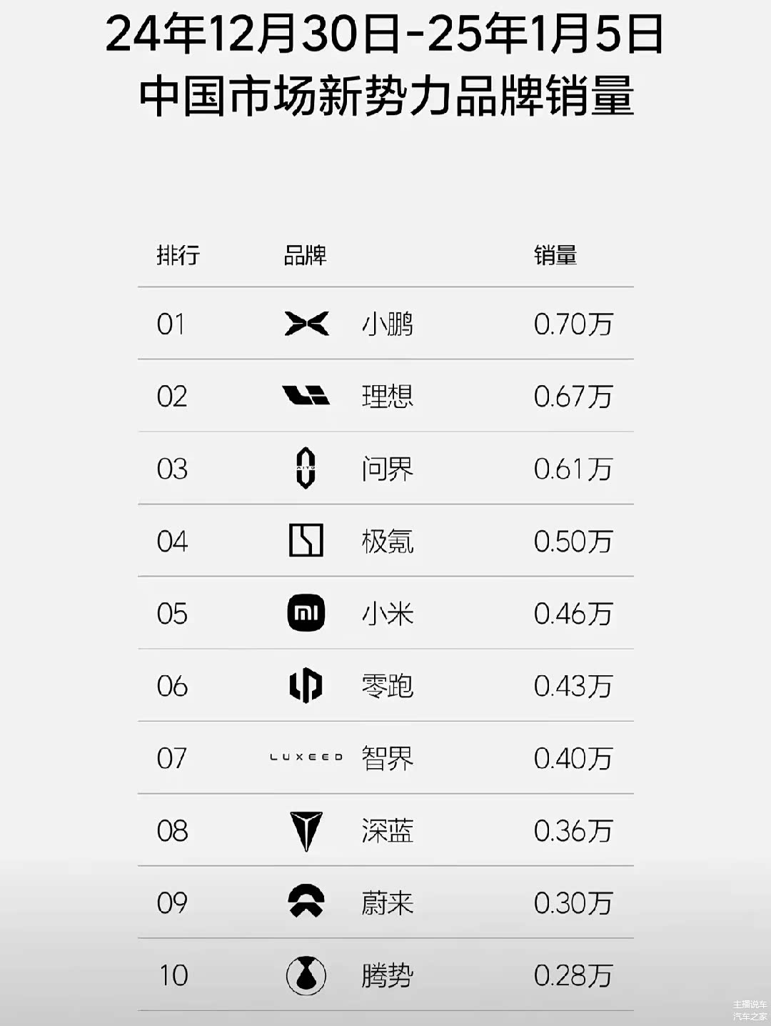 近日,新能源2025年第一周销量出炉。小鹏凭借0.7万辆的成绩不仅超过了特斯拉,理想汽车等品牌,夺得了2025年第一周的销量冠军宝座,而且在自主新势力阵营,小鹏汽车也终于重新回到了第一,夺得了自主新势力的亚军。理想汽车连续36周蝉联中国市场新势力品牌销量第一的记录,正式被小鹏终结。不过,在高端车市场,理想汽车0.67万辆的表现仍然可圈可点。除了小鹏之外,极氪周销量达到0.5万辆,小米也取得了0.46万台的成绩,而智界品牌也取得了0.4万辆的成绩,排名小幅度提升。