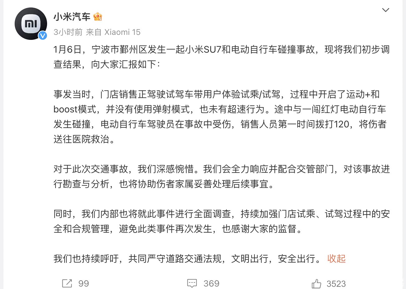 1月6日,宁波市发生一起小米SU7和电动自行车碰撞事故,小米汽车近日发布初步调查结果,事发当时,门店销售正驾驶试驾车带用户体验试乘/试驾,过程中开启了运动+和boost模式,并没有使用弹射模式,也未有超速行为。小米汽车表示,“会全力响应并配合交管部门,也将协助伤者家属妥善处理后续事宜。同时,我们内部也将就此事件进行全面调查。”