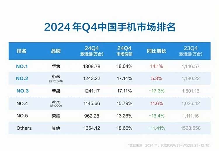 近日,多家权威市场调研机构发布了2024年第四季度中国手机市场的激活量及市场份额排名。数据显示,华为手机成功拿下市场第一,小米位列第二,苹果则退居第三。