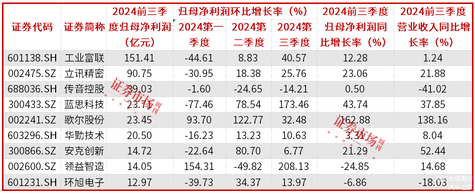 对比来看,消费电子行业则有一定不同。数据显示,消费电子行业2024年前三季度归母净利润规模超过10亿元的公司有9家,其中歌尔股份2024前三季度营收和归母净利润均实现翻倍增长,单季度业绩环比均实现双位数甚至翻倍式增长(见表2)。